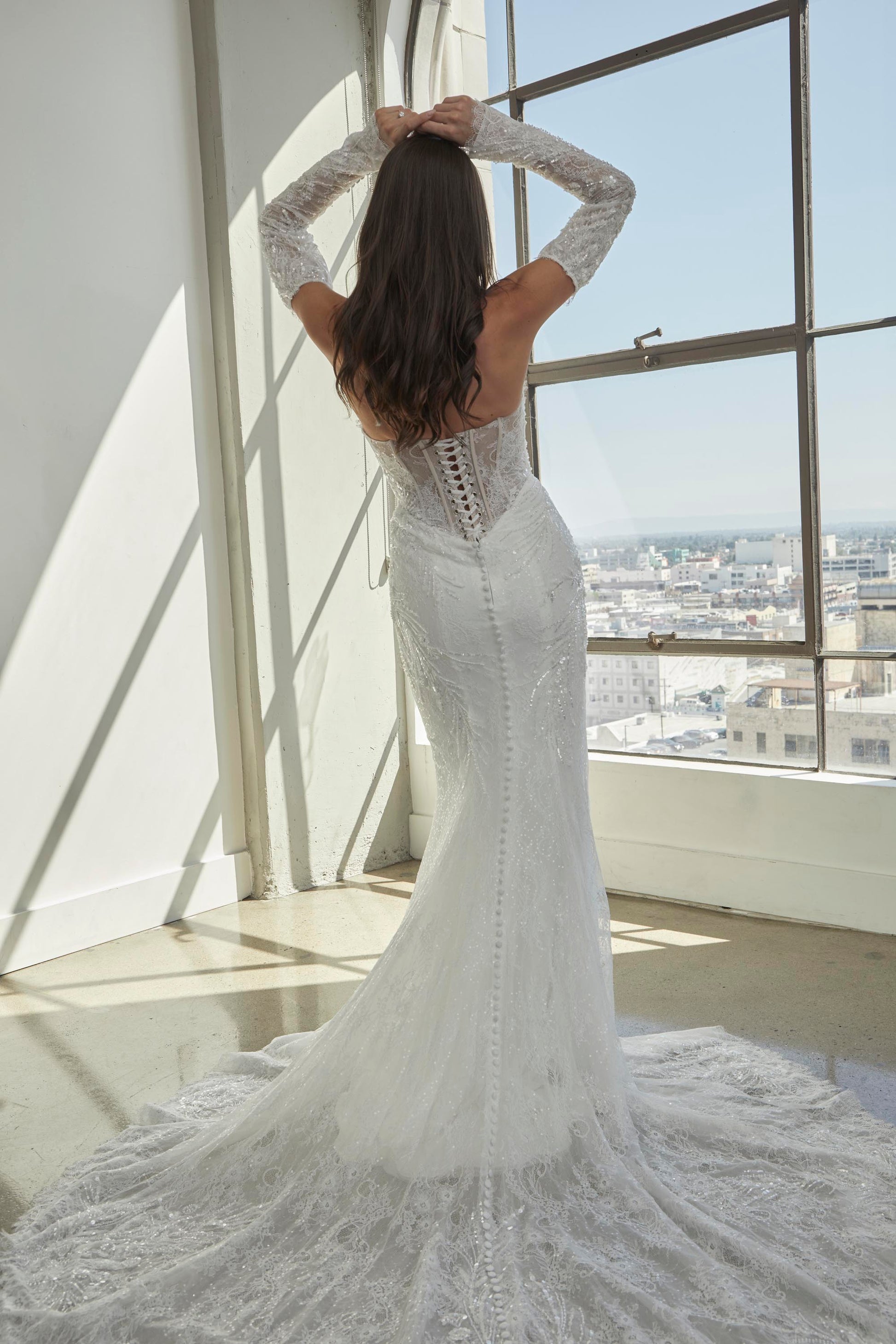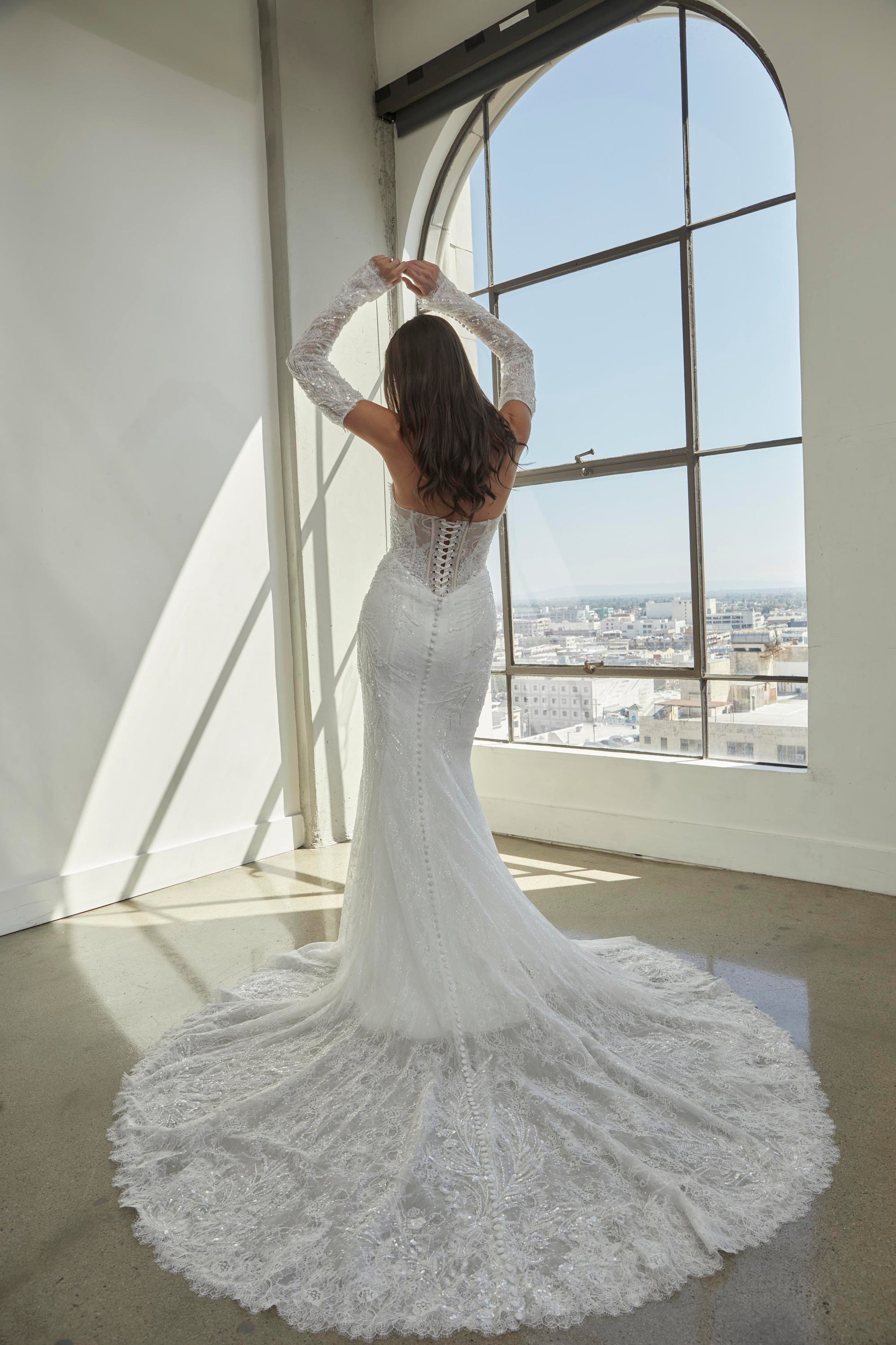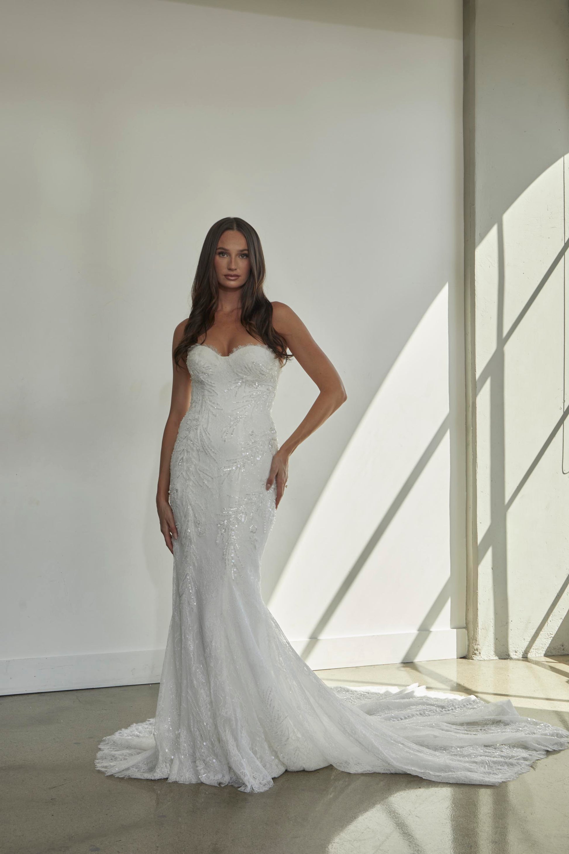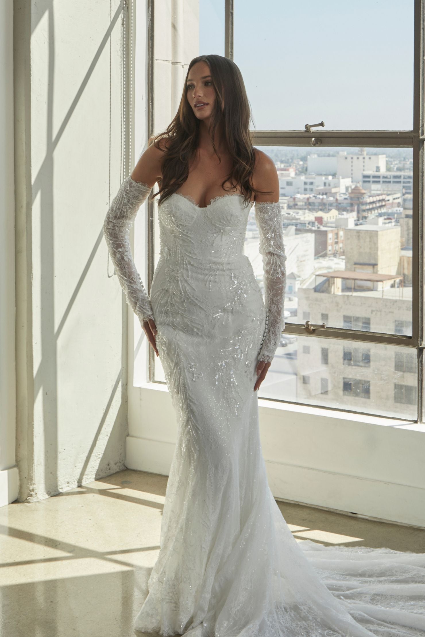 ANDRINA is a breathtaking gown designed for the bride who craves a blend of elegance and drama. Featuring exquisite Chantilly lace with delicate beaded appliqué accents, this gown brings sophistication to life. The strapless bustier bodice is lined for comfort, adorned with intricate beaded details and a stunning eyelash trim along the neckline. Fitted off-shoulder long sleeves with button closures add a touch of vintage elegance, while the form-fitting skirt, with vertical body seams, creates a flattering silhouette. The eyelash lace hem and beaded appliqué accents on the sides and train provide a striking finish, making ANDRINA perfect for a romantic ballroom or intimate garden wedding. Inspired by the beauty of delicate lace and intricate detailing, this gown ensures the bride feels elegant and effortlessly beautiful on her special day.