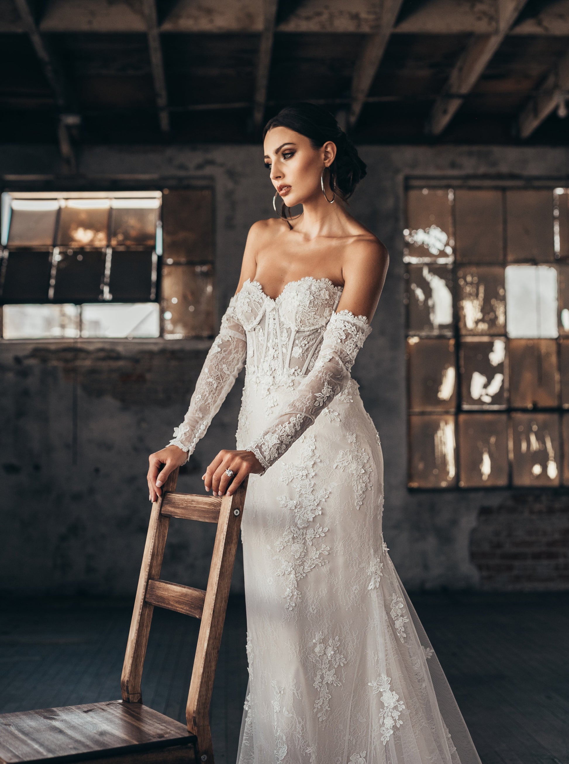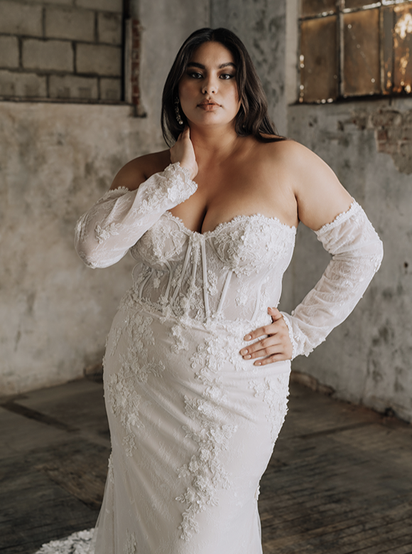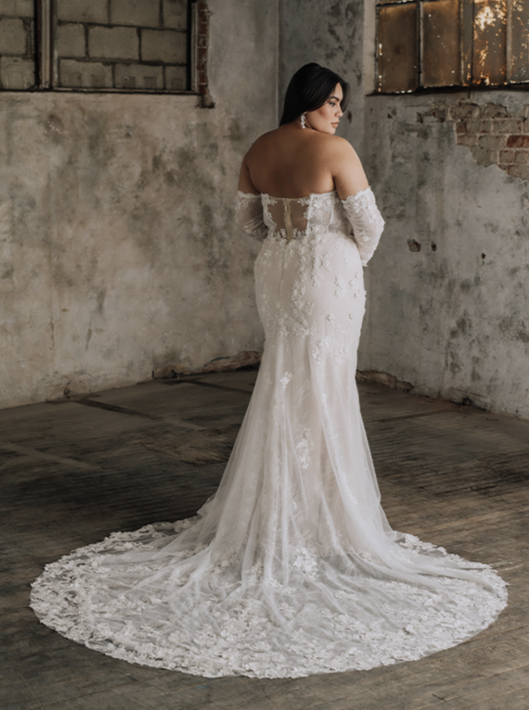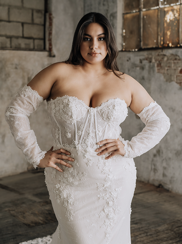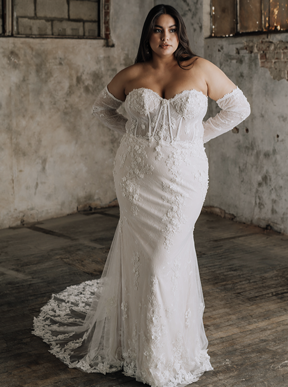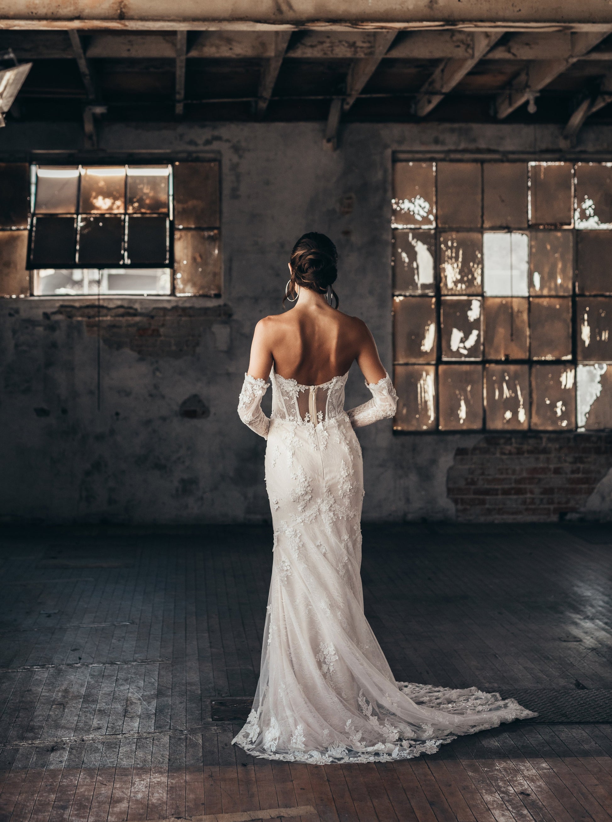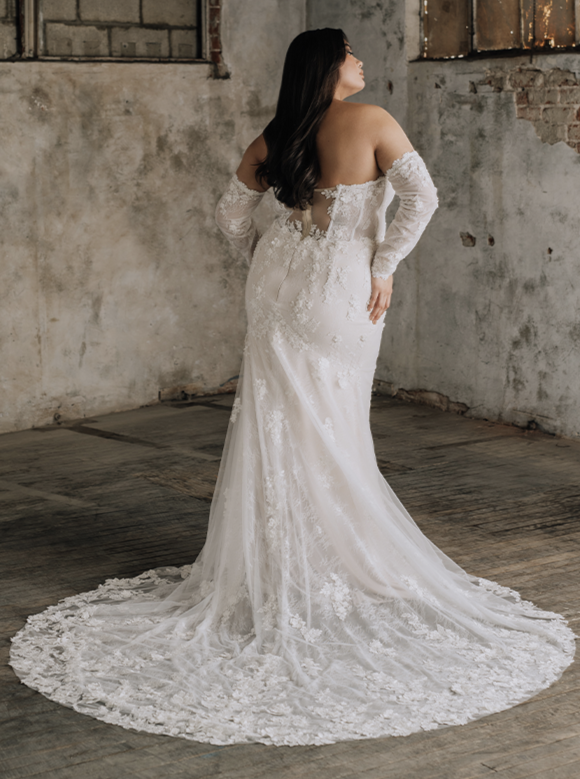 If you're going to opt for sultry long sleeves, it doesn't get more fabulous than these scalloped, Chantilly lace-trimmed ones that can be fully removed or worn alone. This tulle-based, lace wedding dress is sure to turn heads with its structured bustier and illusion train adorned with delicate 3D floral appliqués bringing that dramatic effect.