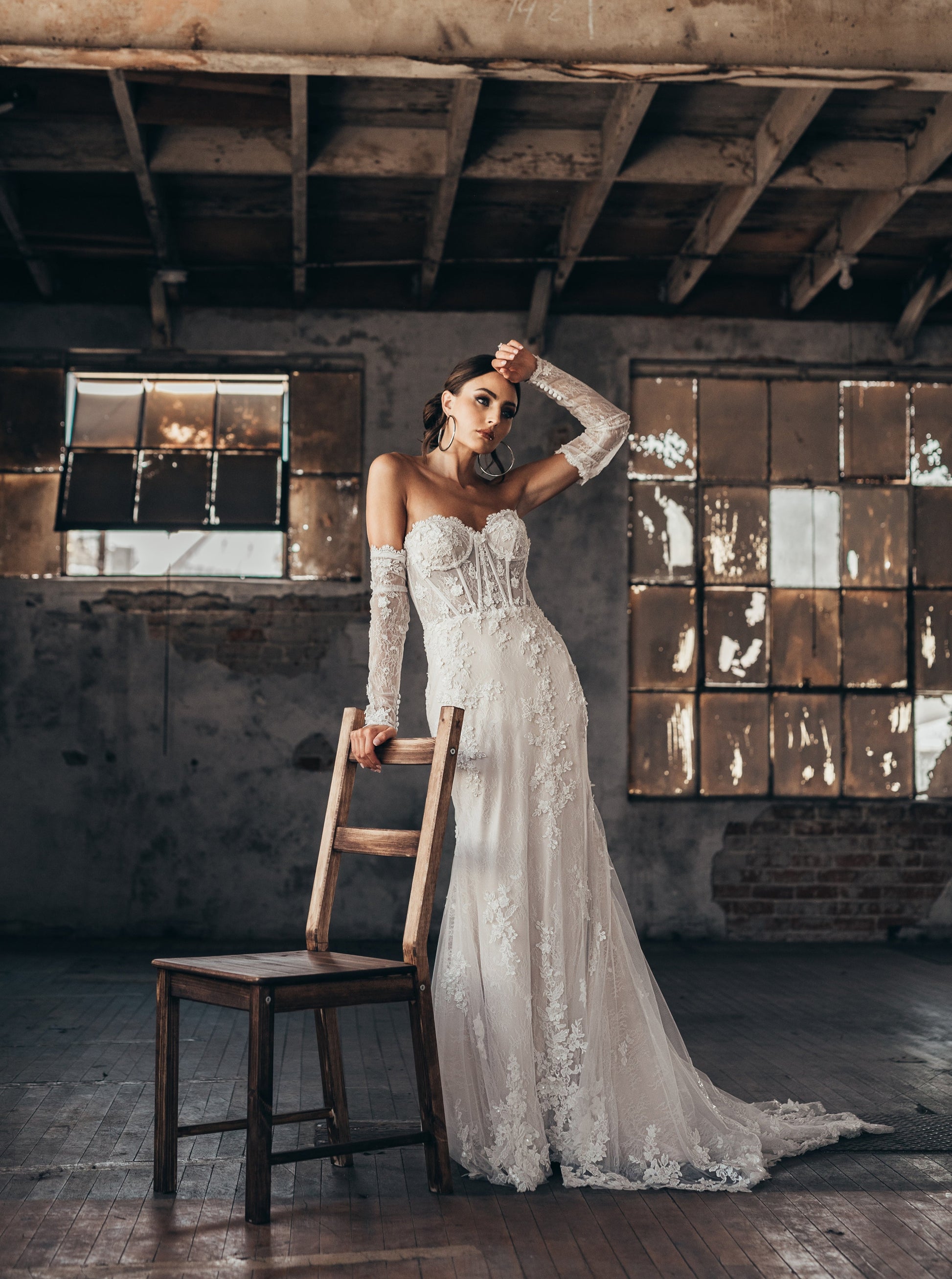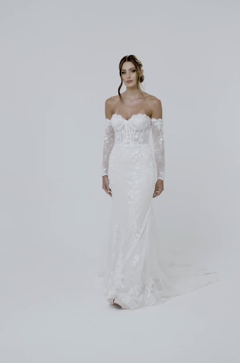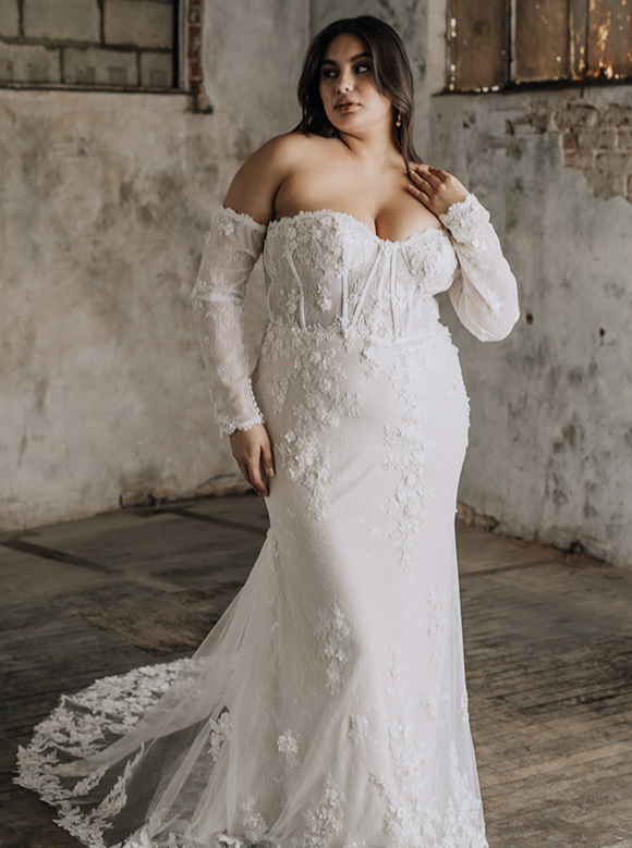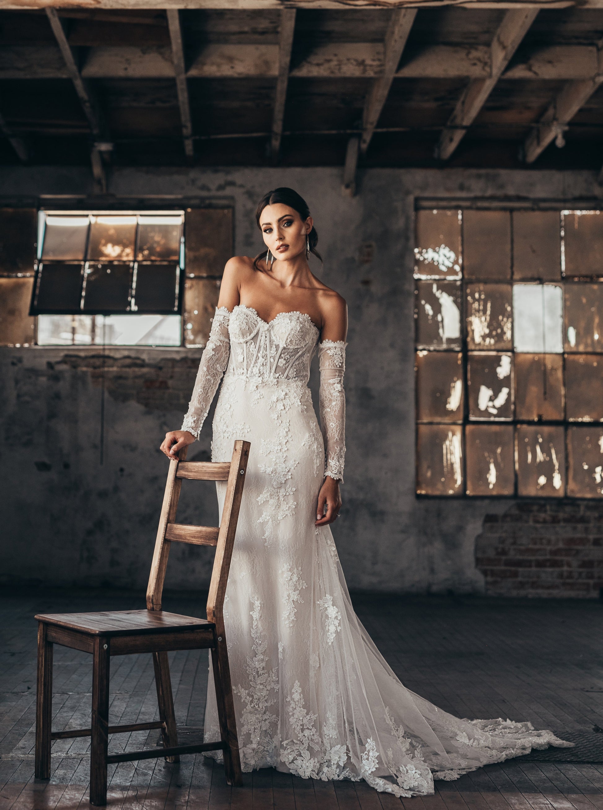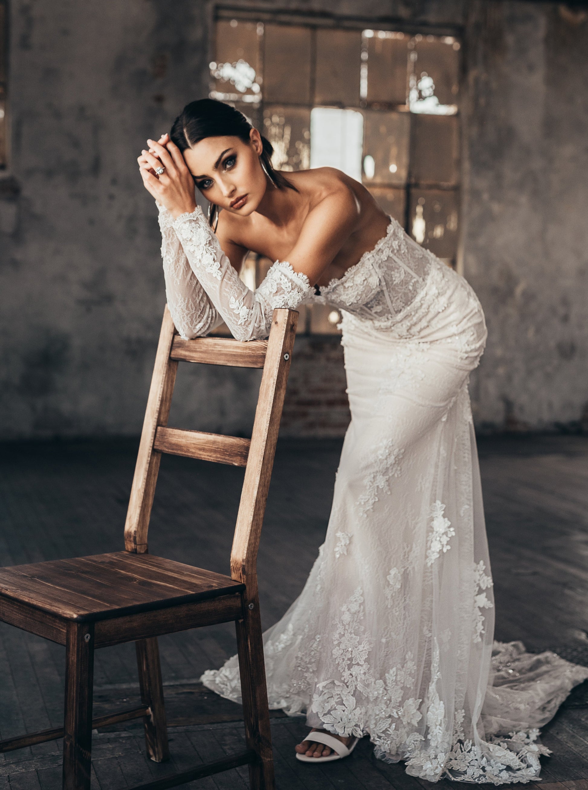 If you're going to opt for sultry long sleeves, it doesn't get more fabulous than these scalloped, Chantilly lace-trimmed ones that can be fully removed or worn alone. This tulle-based, lace wedding dress is sure to turn heads with its structured bustier and illusion train adorned with delicate 3D floral appliqués bringing that dramatic effect.