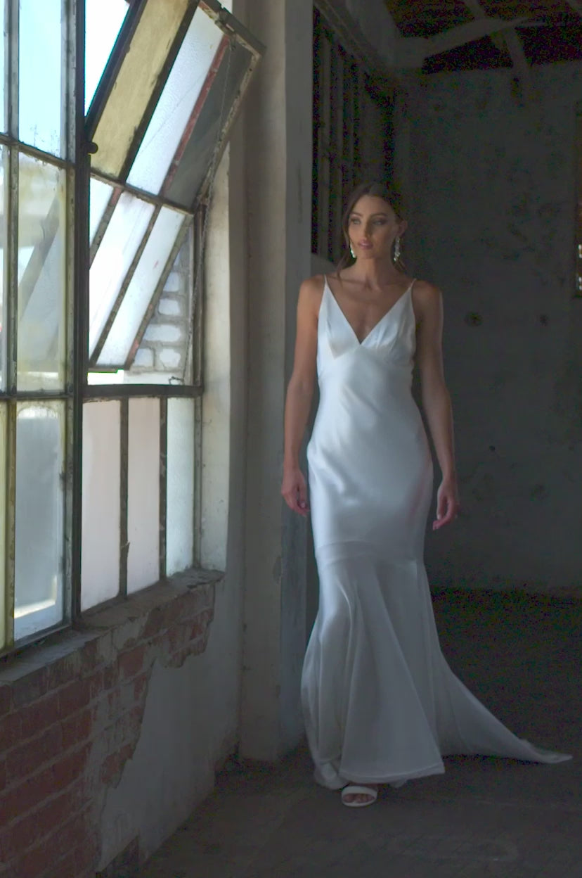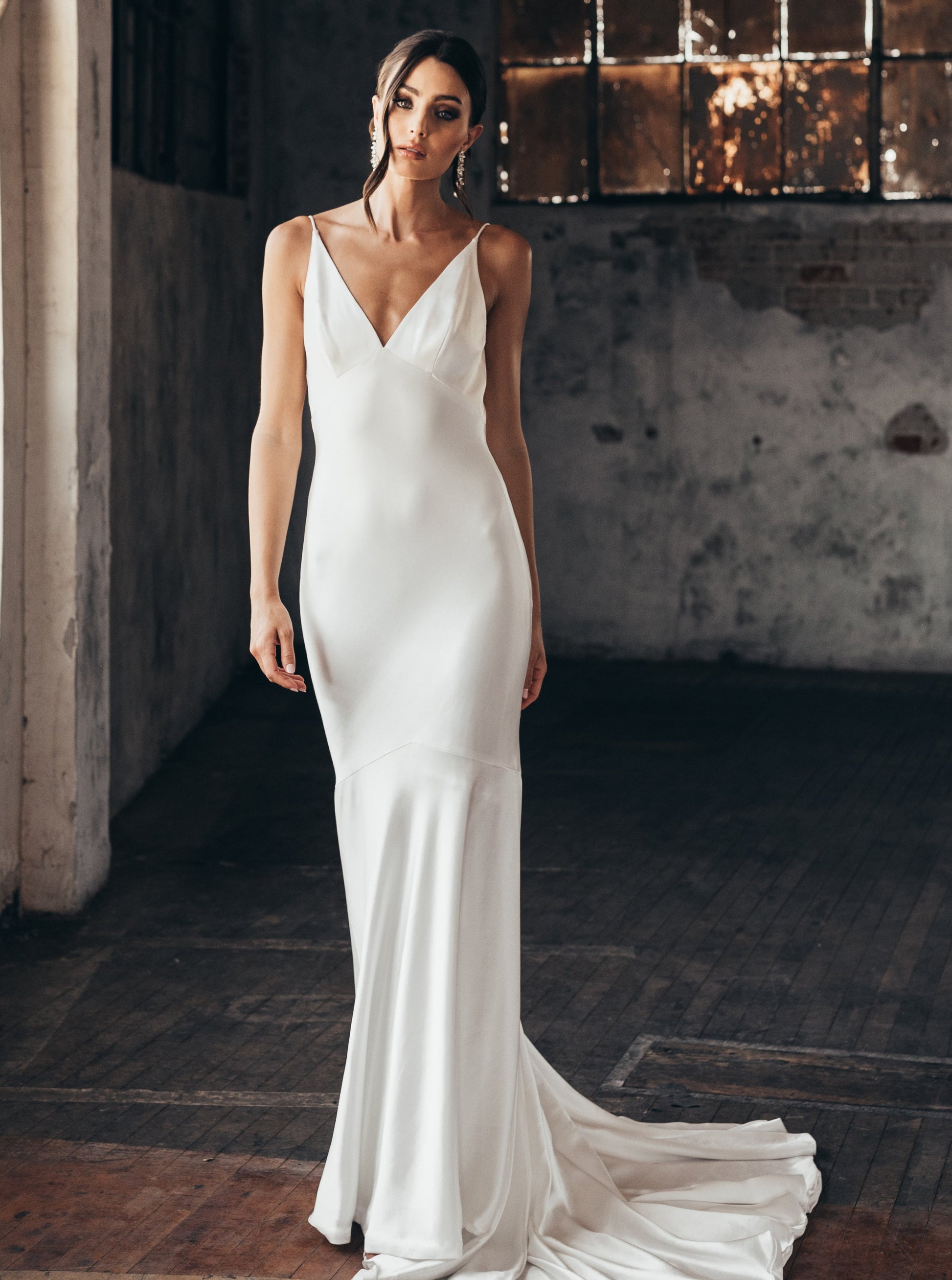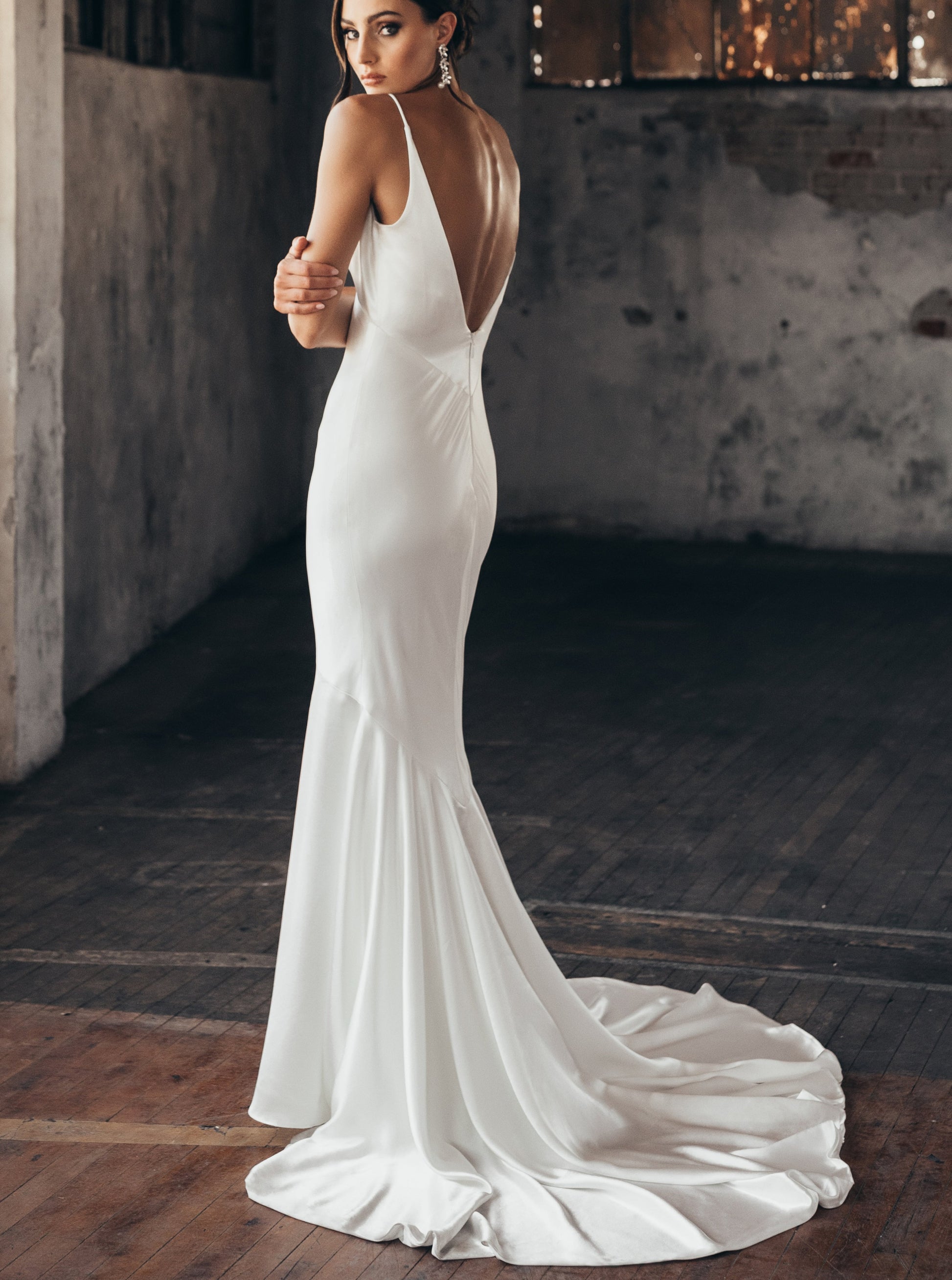 Sleek and modern, this elegantly fitted gown features a luxurious, buttery satin throughout the body, accentuating curves as it glides with your every move. Bethany elicits maximum impact in a minimalist style with daring details like its plunging neckline and dramatic, low-cut back.