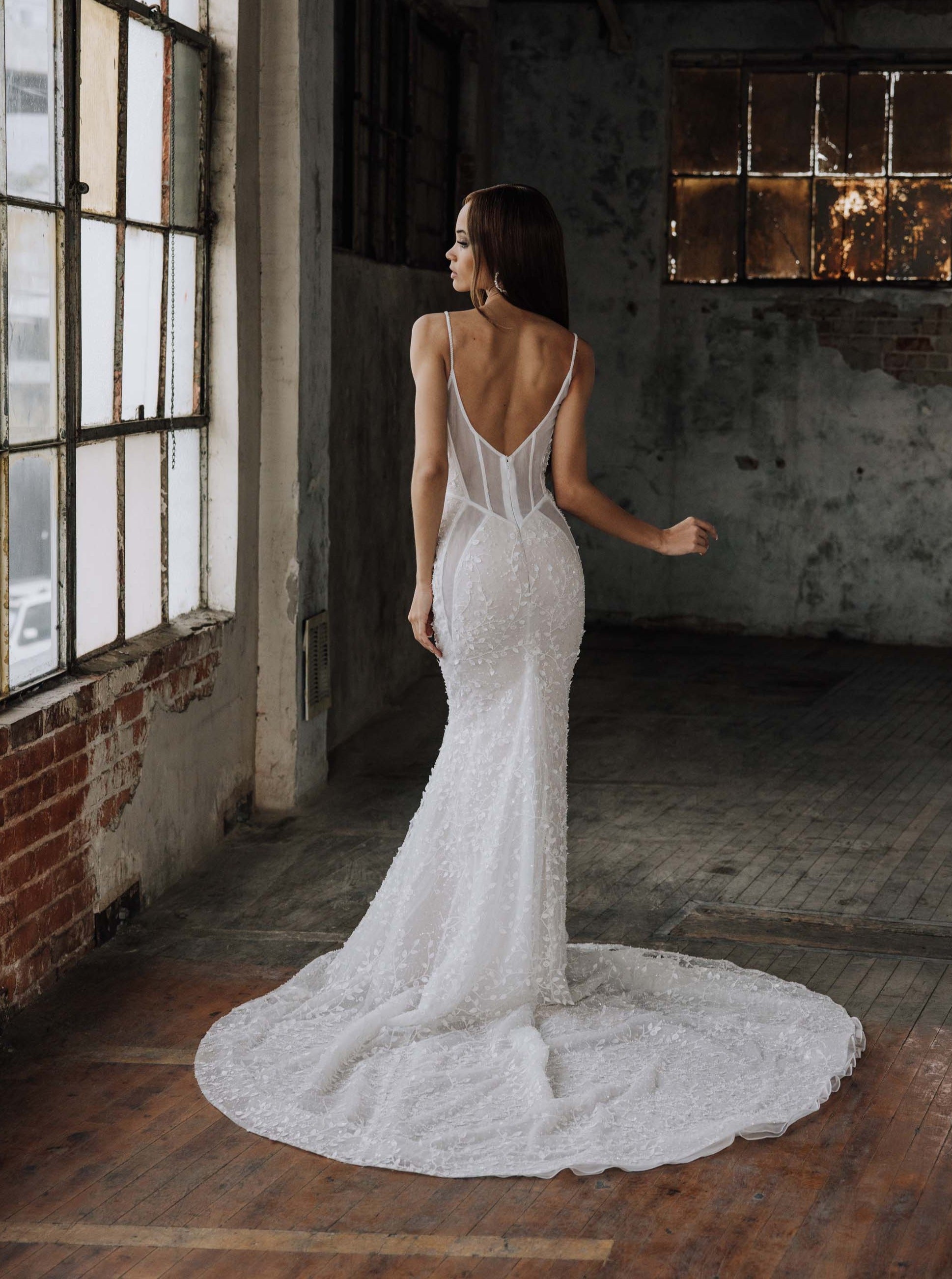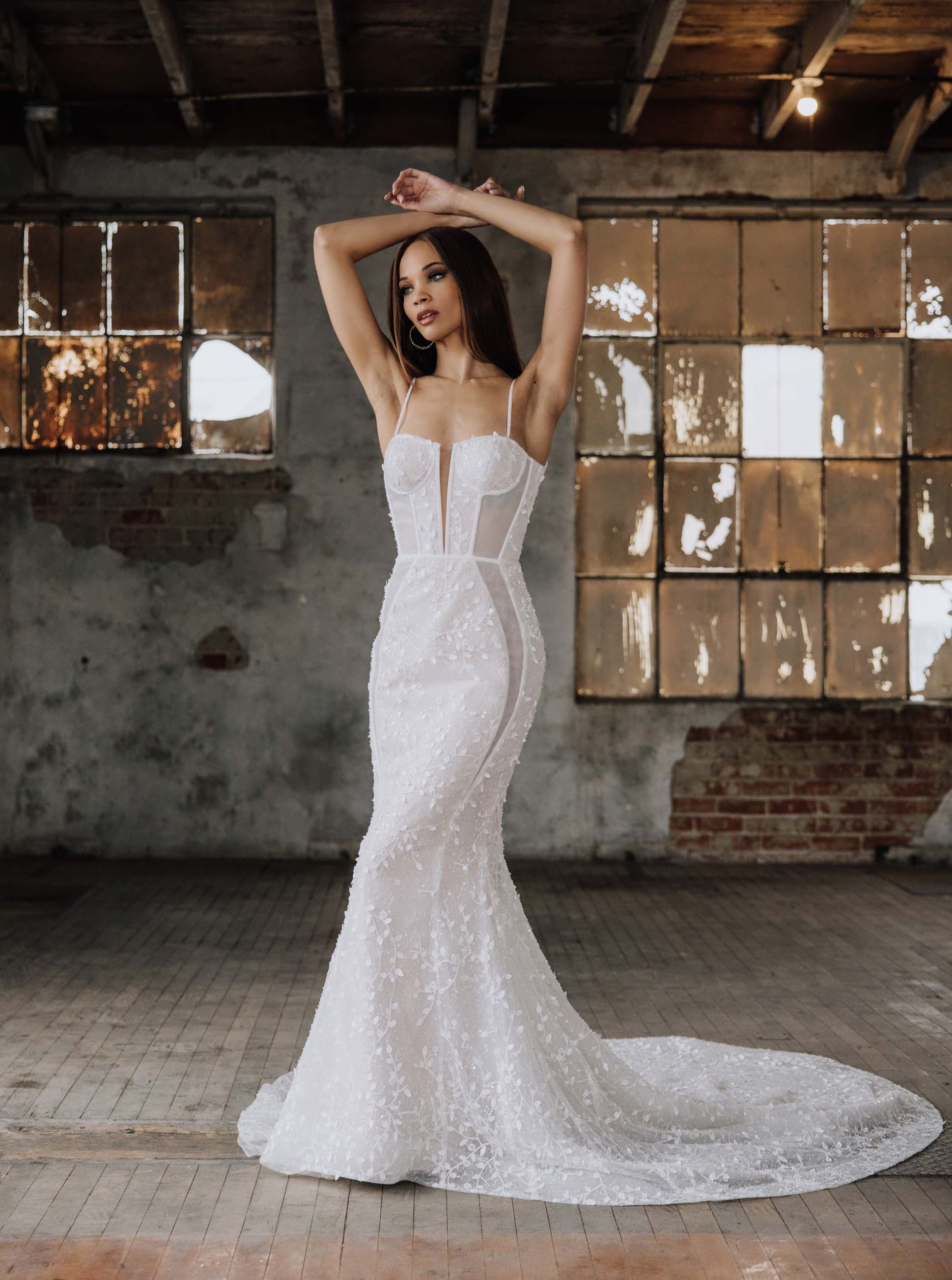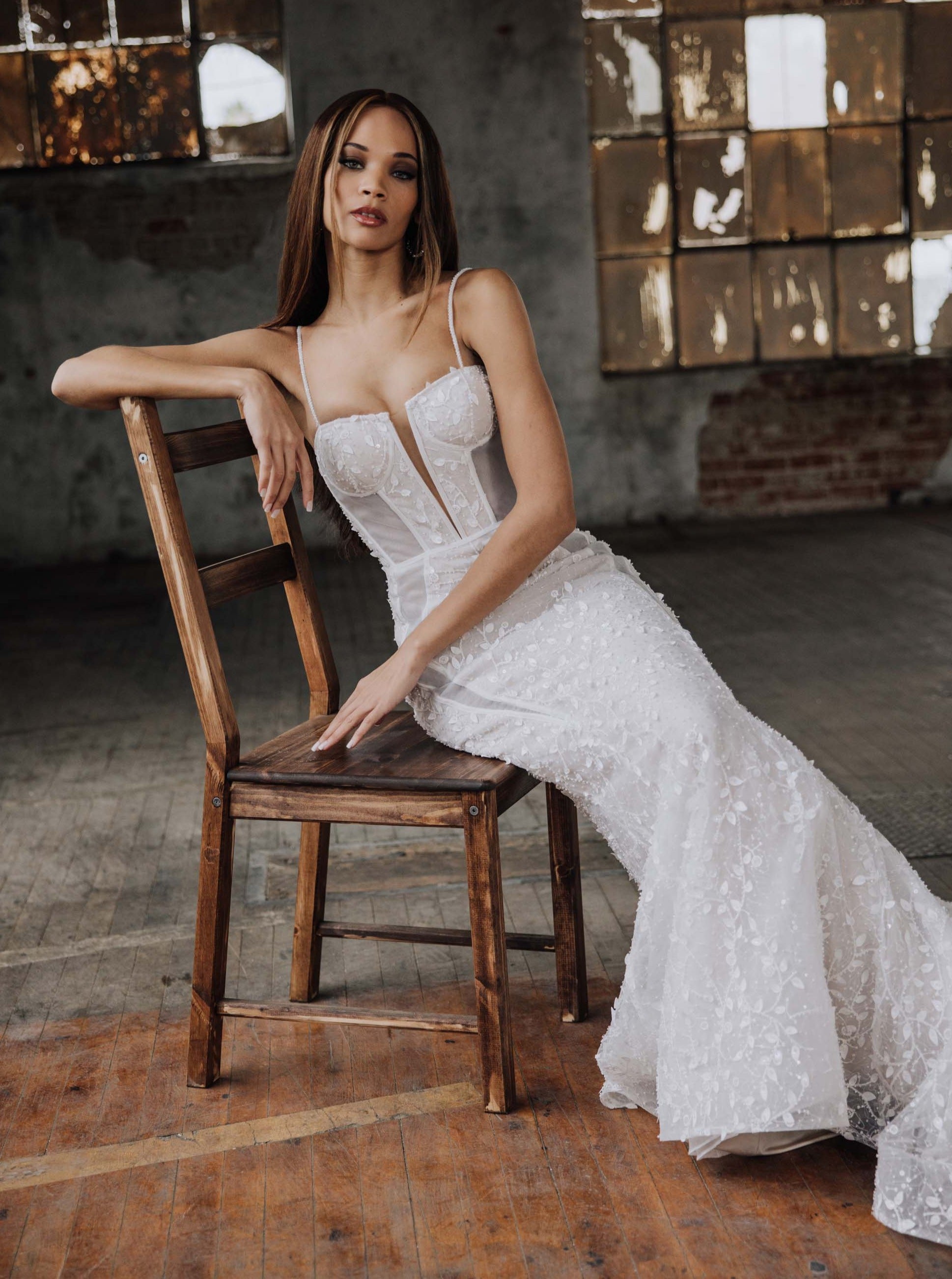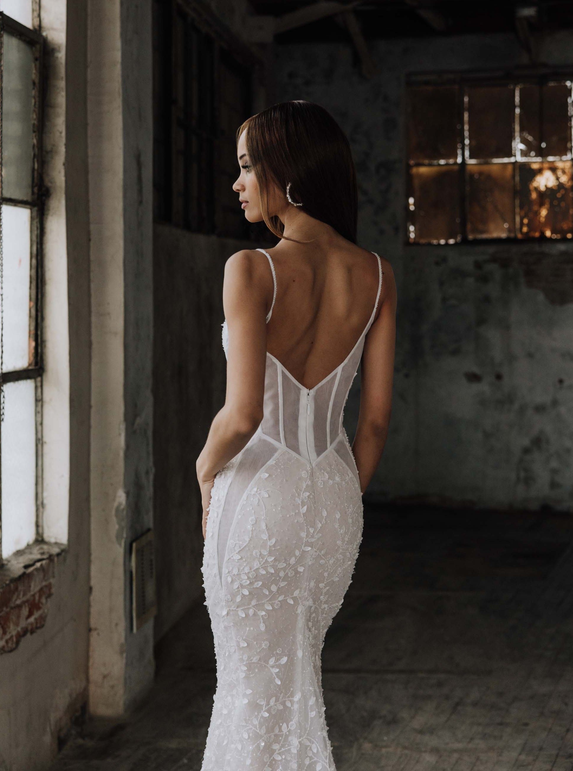 Brienne is the embodiment of sultry allure and captivating sensuality. Crafted with meticulous precision, this wedding dress is a masterpiece of desire. She features an organza base adorned in 3D leafy beaded lace, and seductive sheer side cutouts, casting a mesmerizing spell of sparkling enchantment. With a low "V" back, and graceful train, she guarantees an unforgettable entrance, leaving onlookers captivated by your sheer elegance.