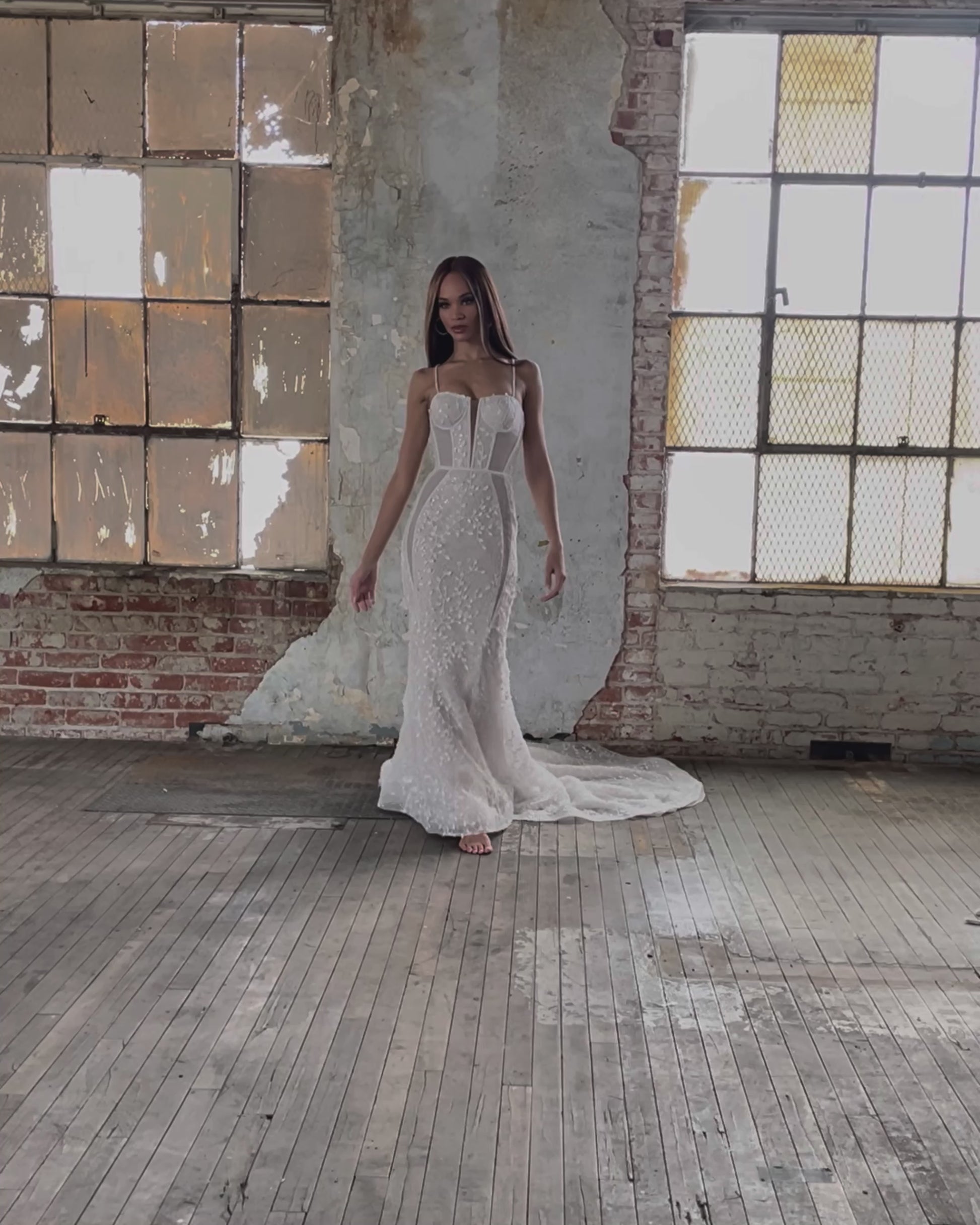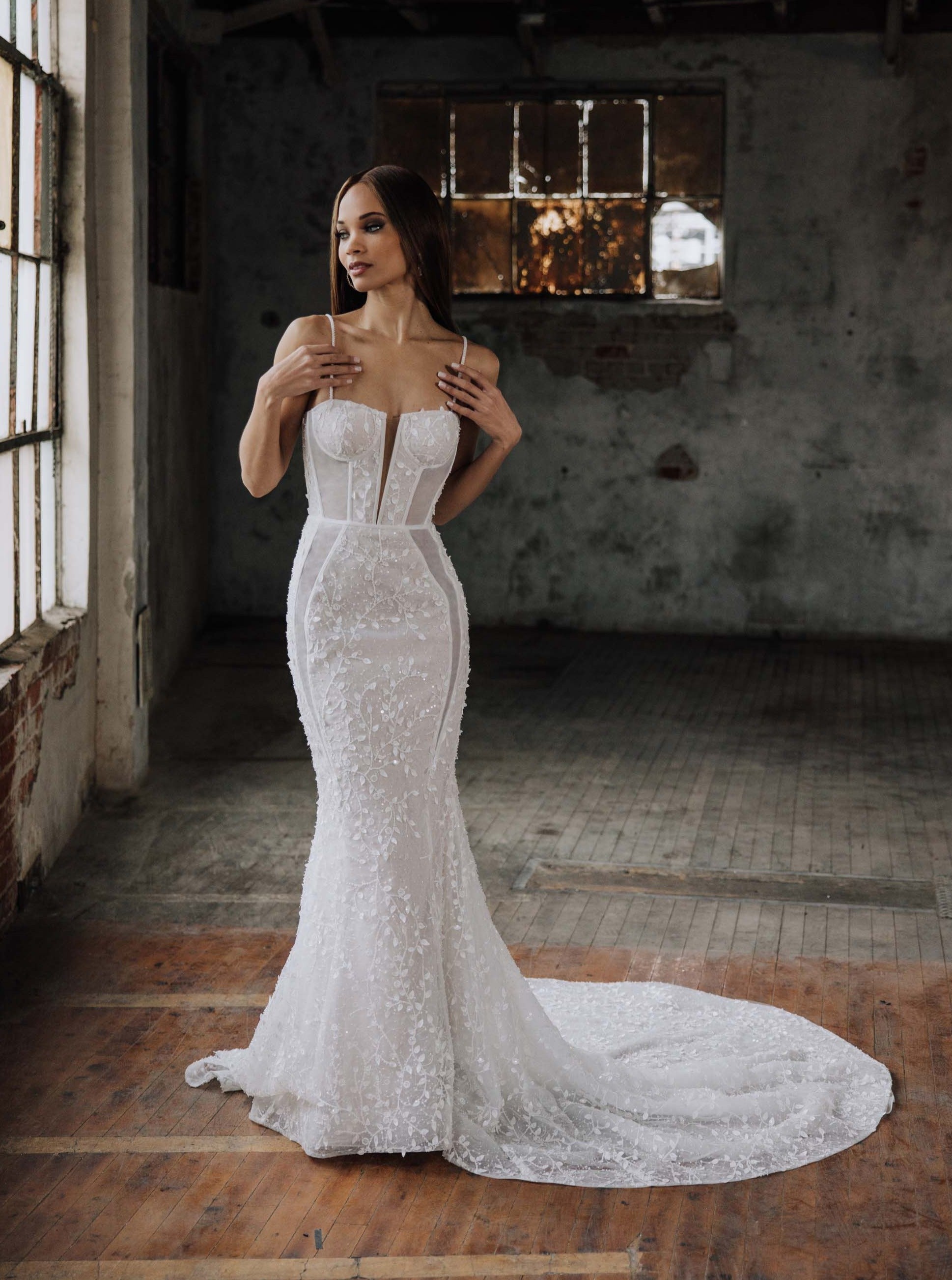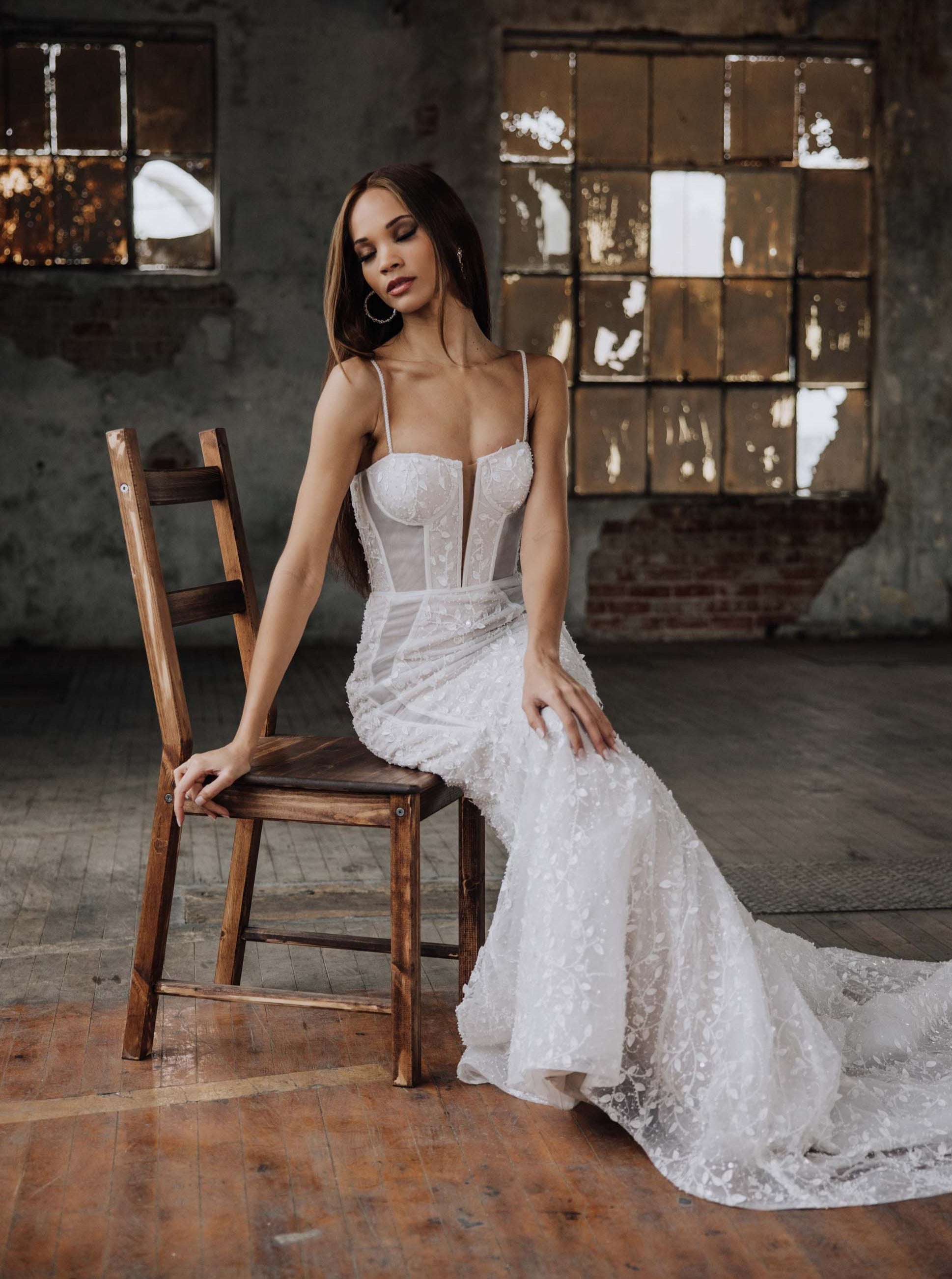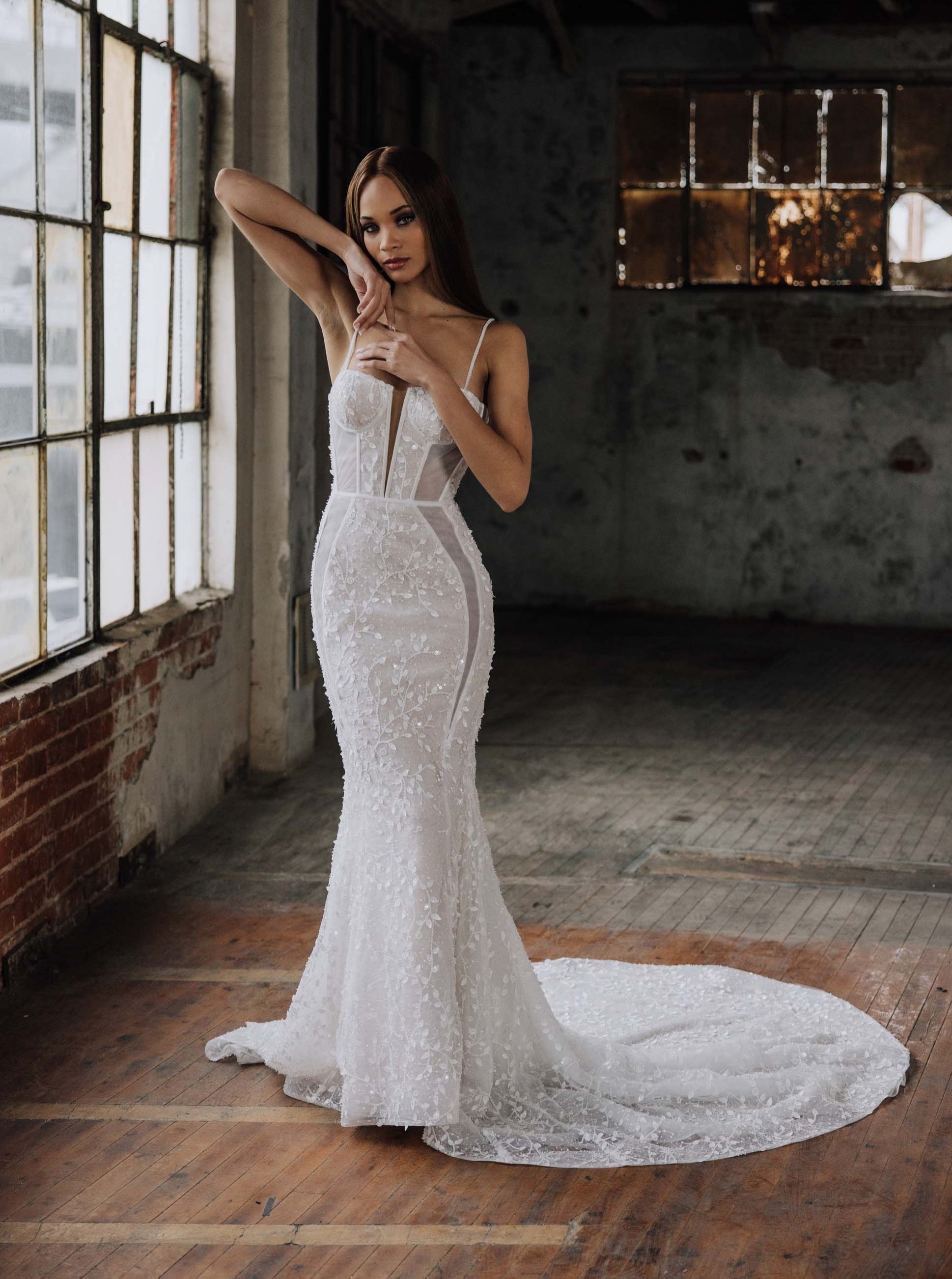 Brienne is the embodiment of sultry allure and captivating sensuality. Crafted with meticulous precision, this wedding dress is a masterpiece of desire. She features an organza base adorned in 3D leafy beaded lace, and seductive sheer side cutouts, casting a mesmerizing spell of sparkling enchantment. With a low "V" back, and graceful train, she guarantees an unforgettable entrance, leaving onlookers captivated by your sheer elegance.