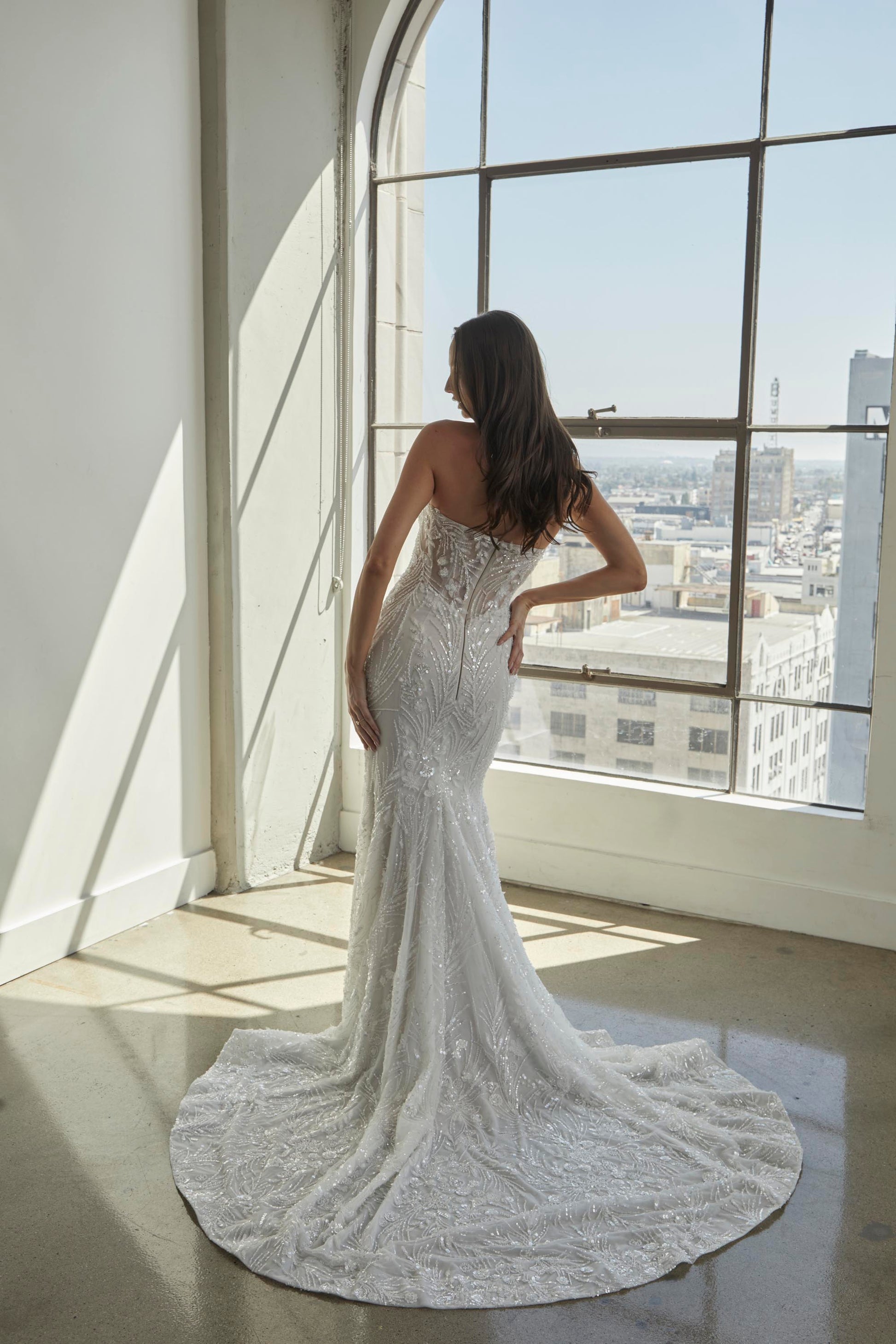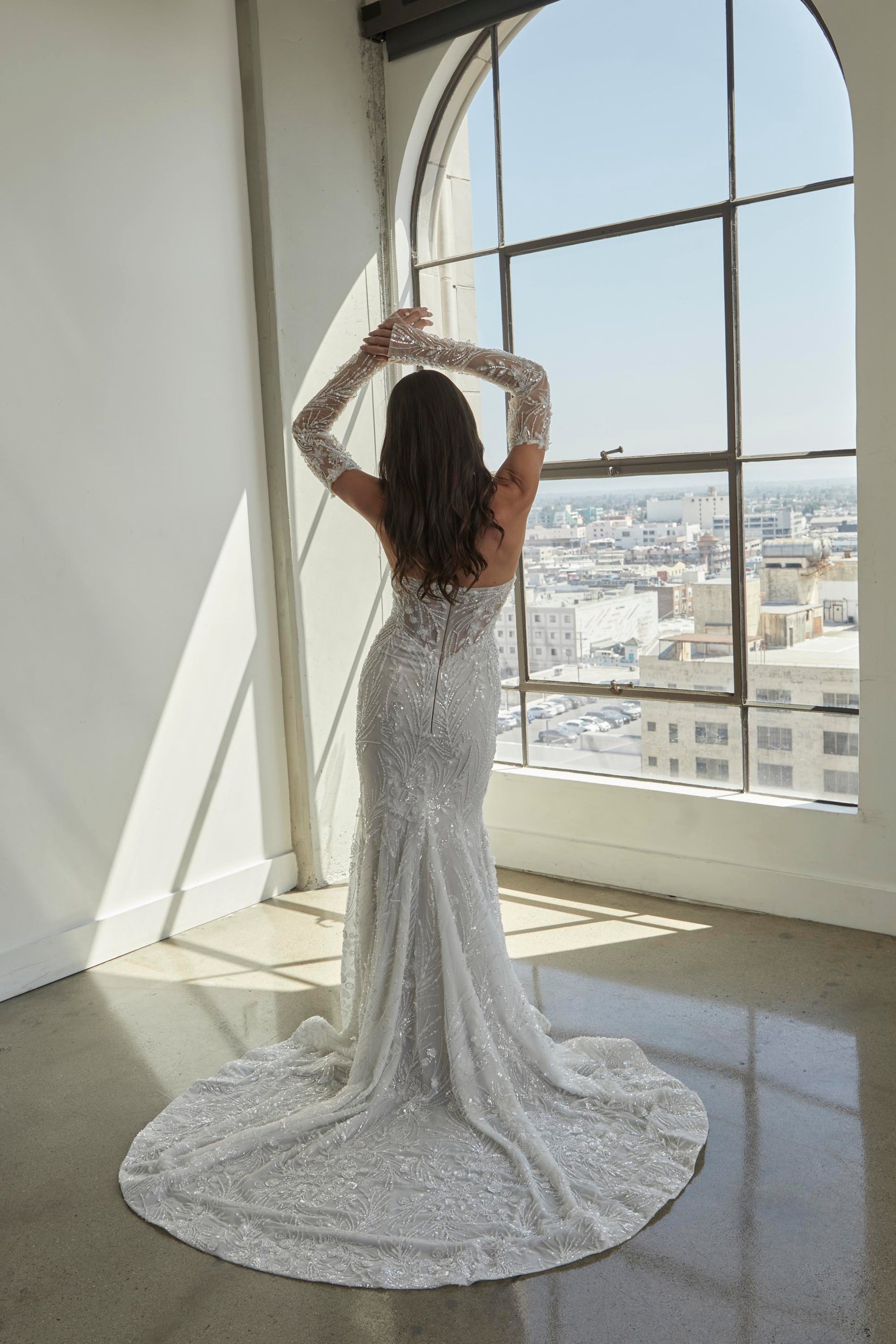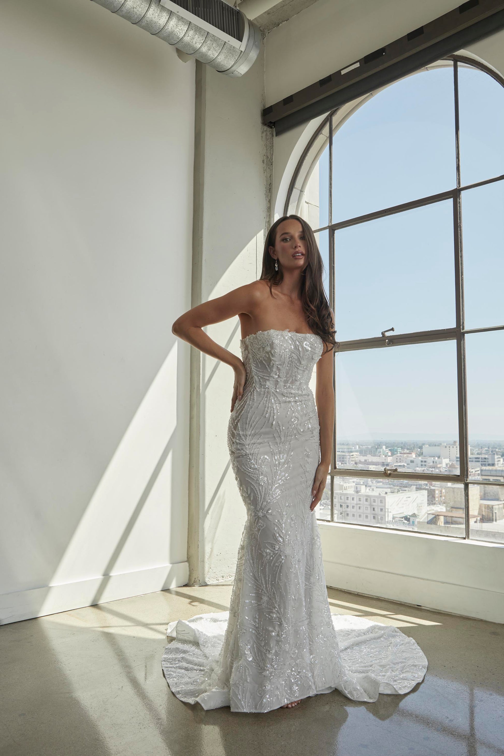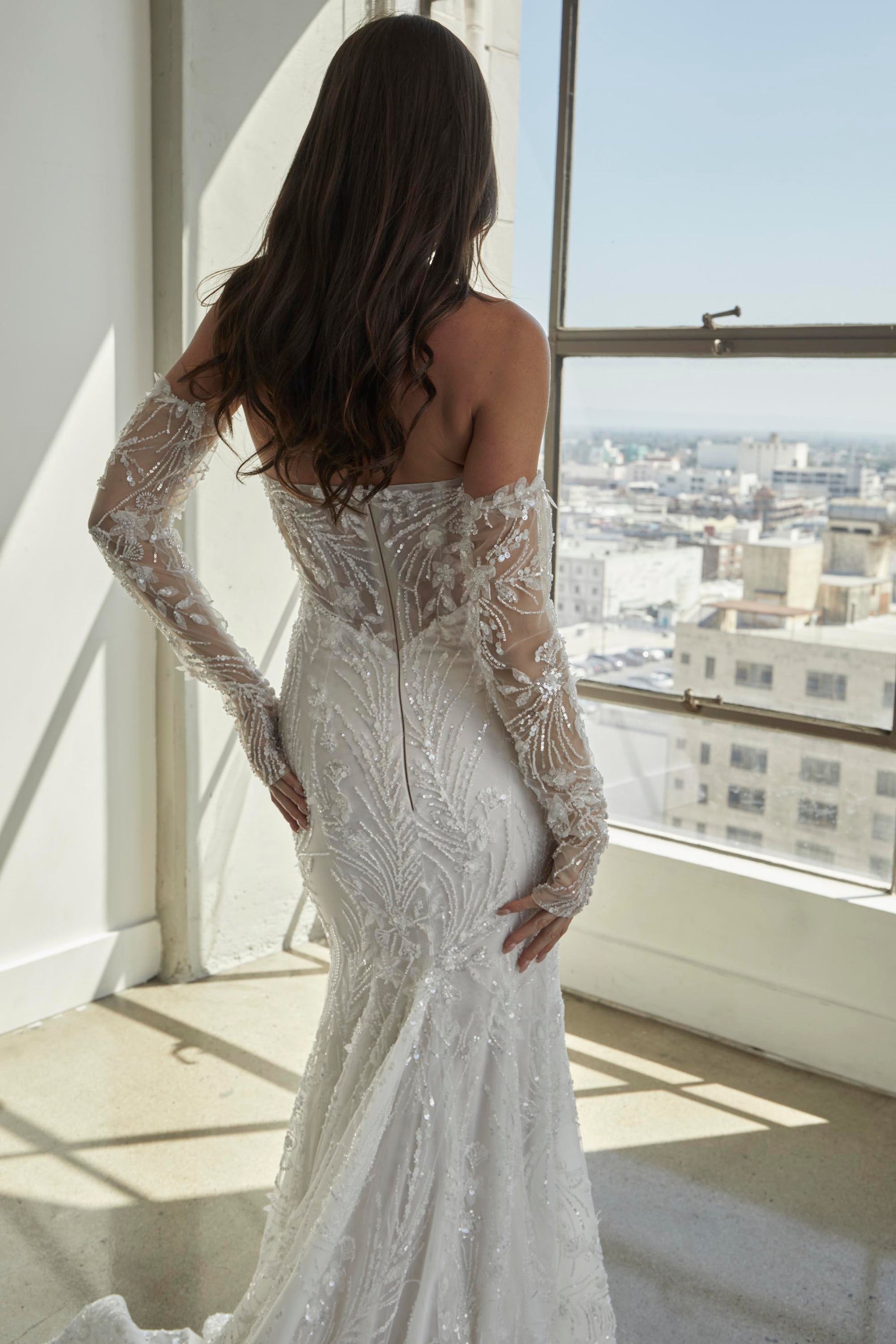 CALYPSO is a striking wedding gown that blends delicate sophistication with bold details for the bride who wants to make an unforgettable impression. Crafted from intricate beaded sheet lace, this gown features a strapless straight-across neckline with sheer side accents that create a flattering, modern silhouette. The fitted off-shoulder long sleeves with button closures add a touch of refined elegance, while the fitted skirt with sheer side accents and a horsehair trim along the hem brings a sense of movement and structure. Perfect for an upscale ballroom wedding or an intimate, elegant affair, CALYPSO is inspired by the fusion of vintage glamour and modern artistry, offering a gown that enhances every bride's natural beauty.