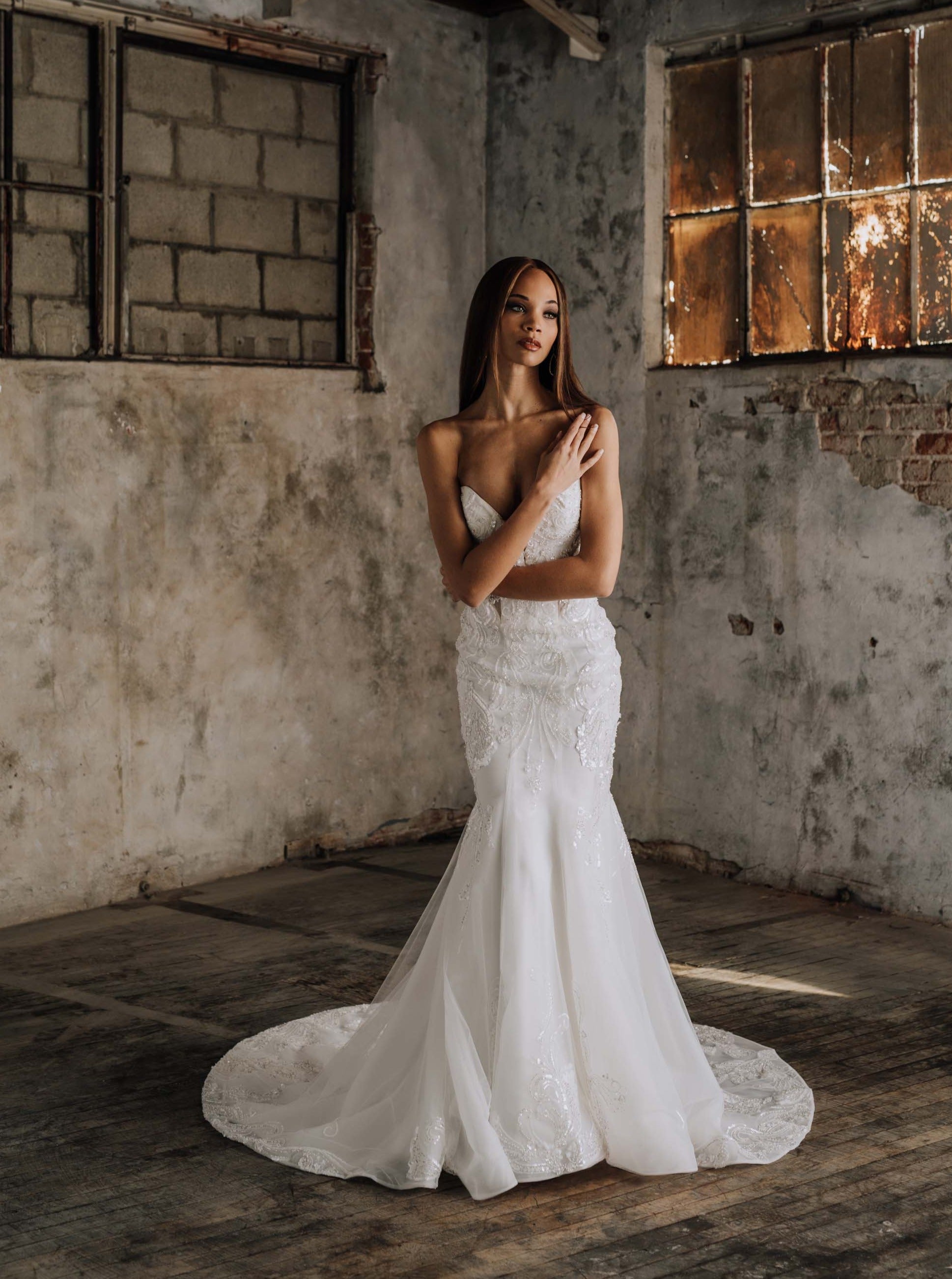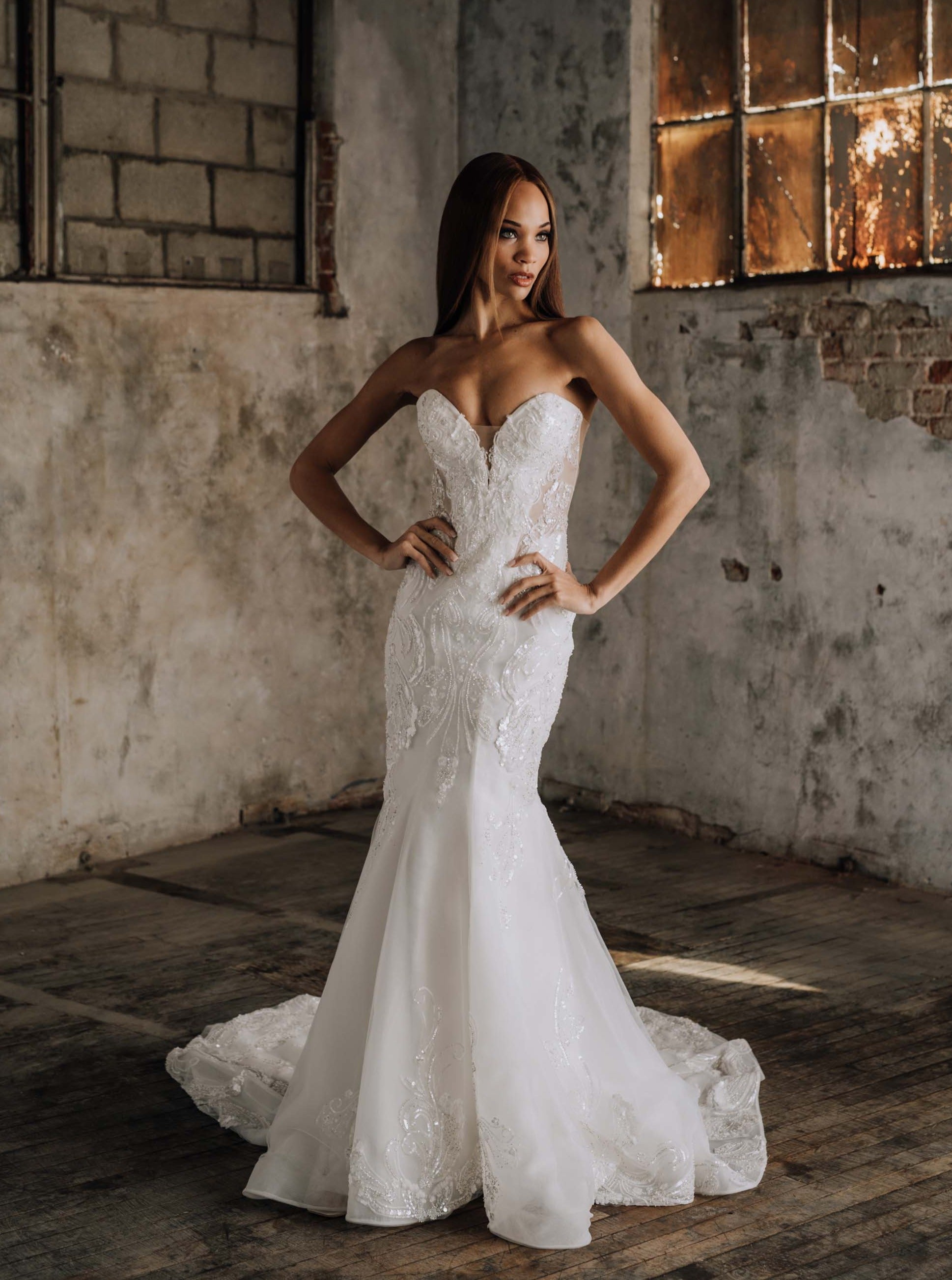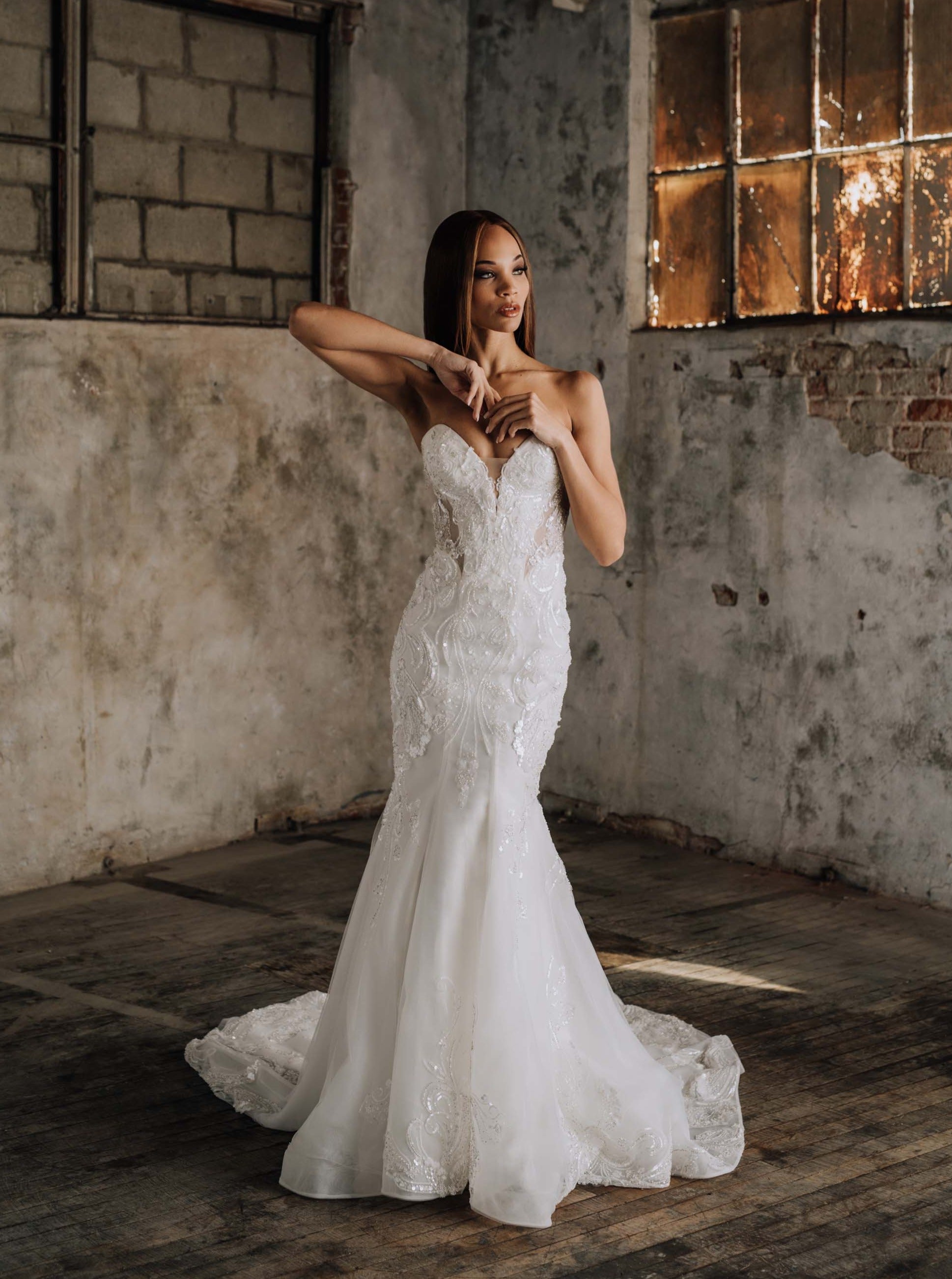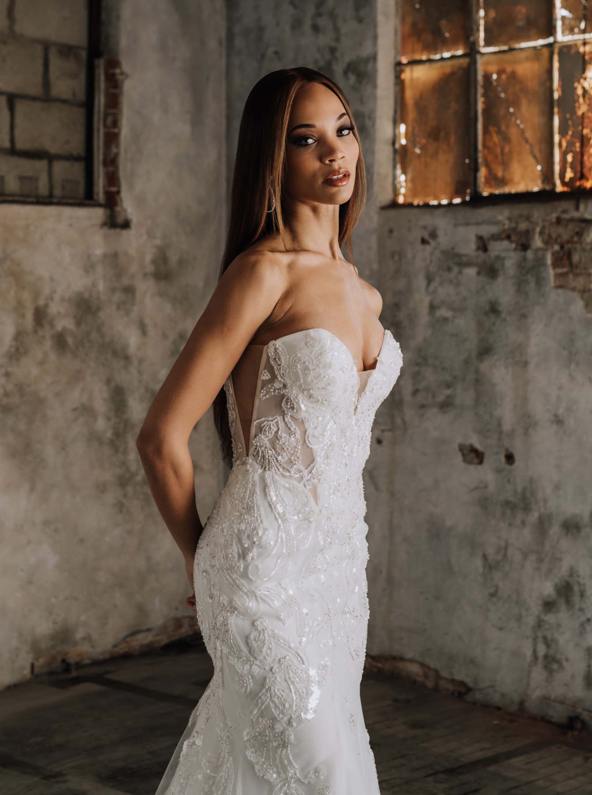 Christina is the epitome of sultry allure and captivating glamour. This statement-making wedding dress is designed for the cool, confident bride who seeks to command attention. With a deep plunging sweetheart neckline and stunning sheer accents, Christina creates a dramatic and sophisticated silhouette. Heavily beaded details and silver accents add sparkle, while illusion side cutouts provide comfort and style. Perfect for glamorous and glitzy weddings, Christina allows the bride to embrace her sensuality and make a bold, unforgettable entrance.