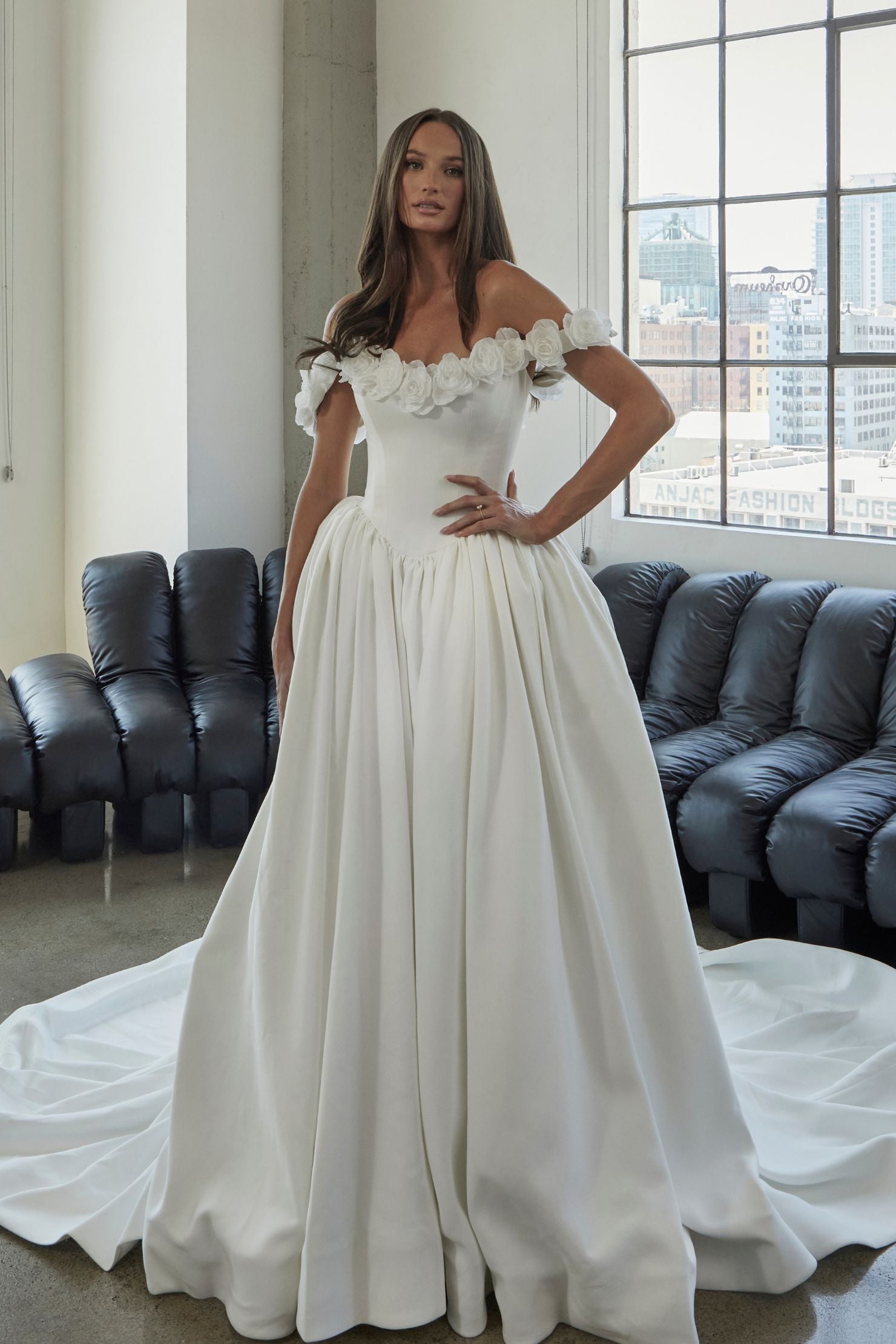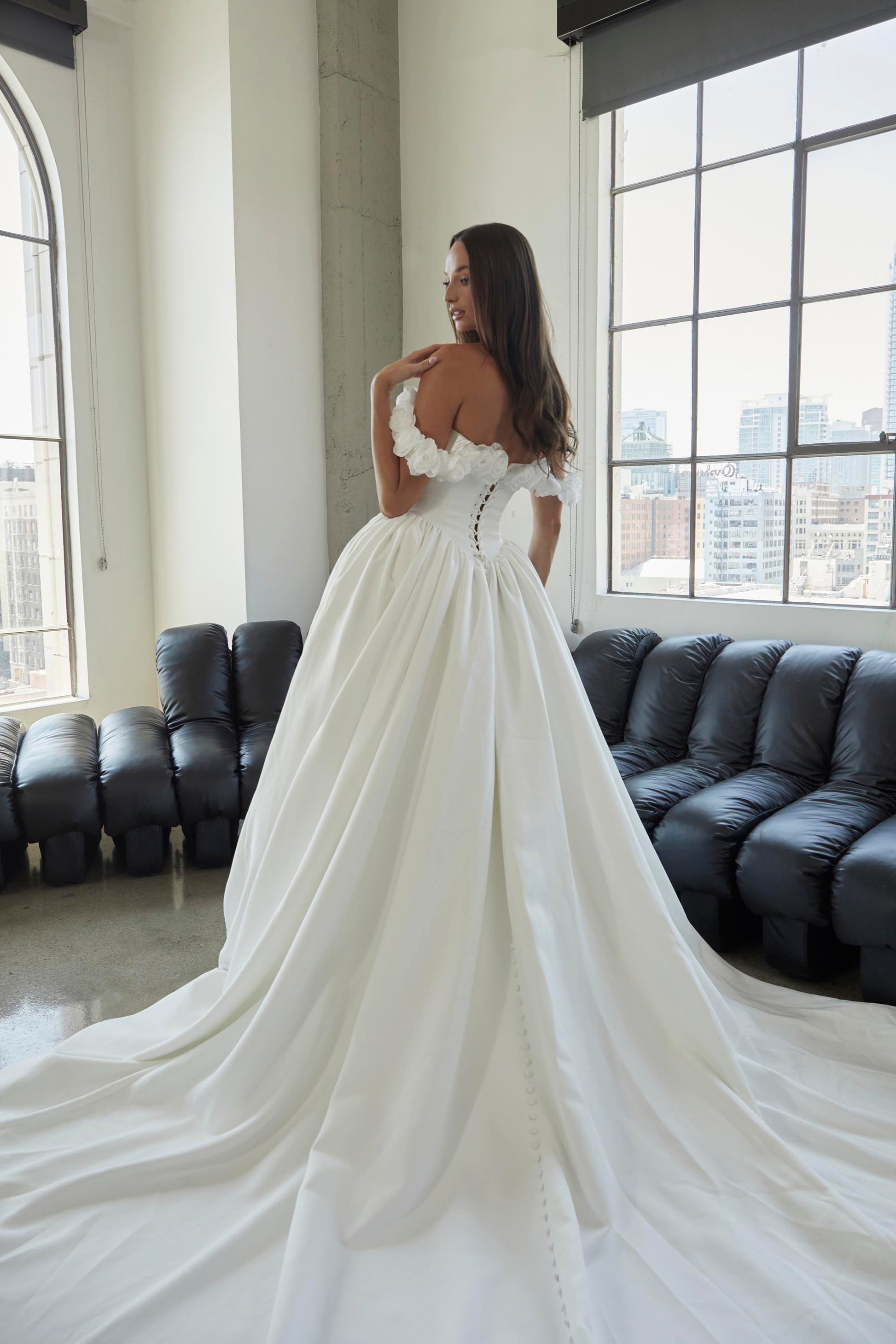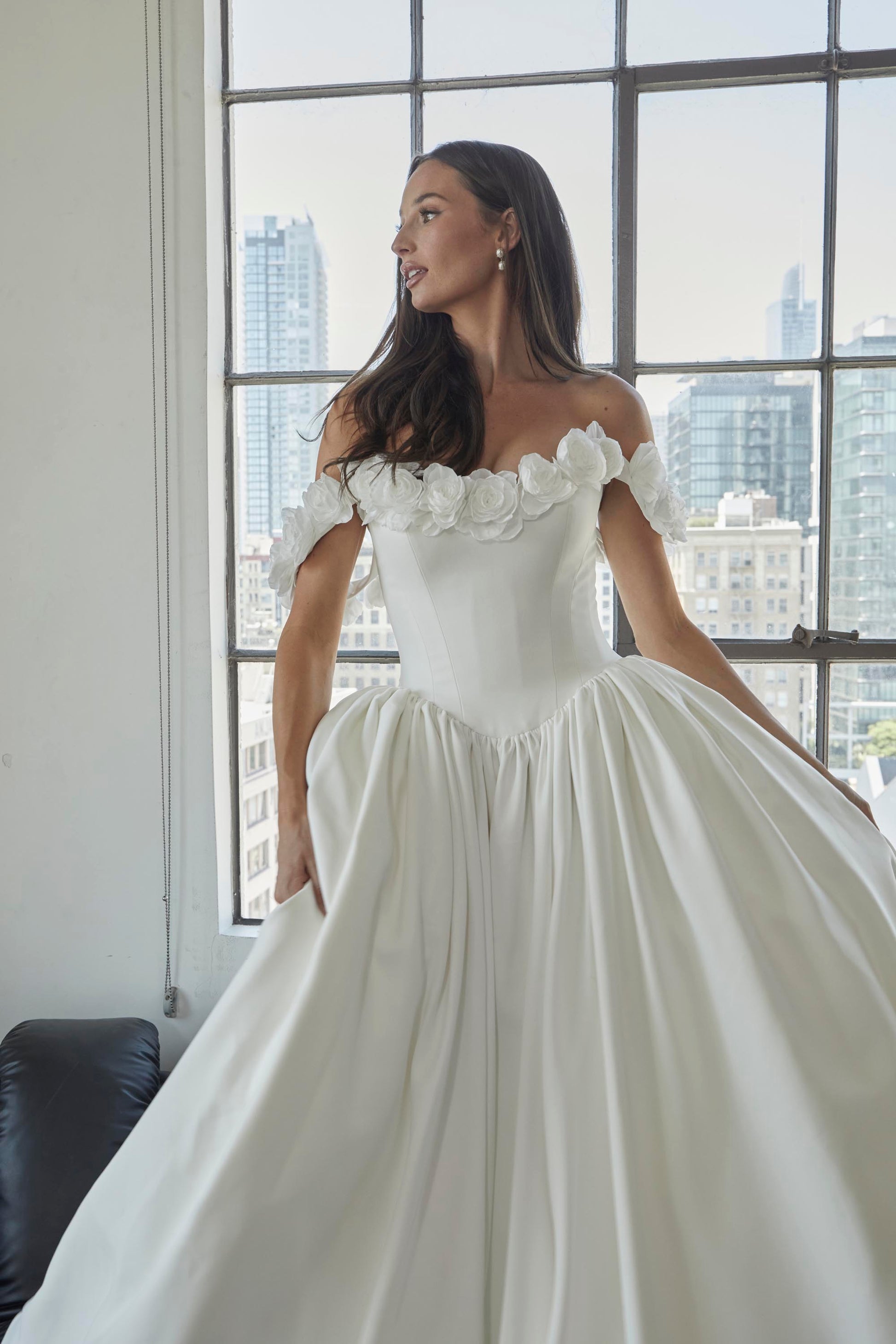 MELAINA is a bold and romantic gown designed for the bride who wants to make a statement with her wedding dress. Crafted from luxurious matte satin, this gown features stunning laser-cut flowers that add intricate detail and depth. The strapless bodice with a curved neckline and drop bateau waistline creates a flattering silhouette, while the realistic 3D flowers stitched along the neckline add a delicate touch. The grommet corset closure ensures a perfect fit, while the attached off-shoulder sleeves, embellished with 3D flower appliqués, offer a soft, feminine finish. The extremely full skirt, gathered along the waistline, flows elegantly, and the practical pockets sewn into the side seams provide both style and function. Perfect for a grand ballroom wedding or an extravagant garden celebration, MELAINA is inspired by nature's beauty and designed to captivate the bride seeking an unforgettable look.