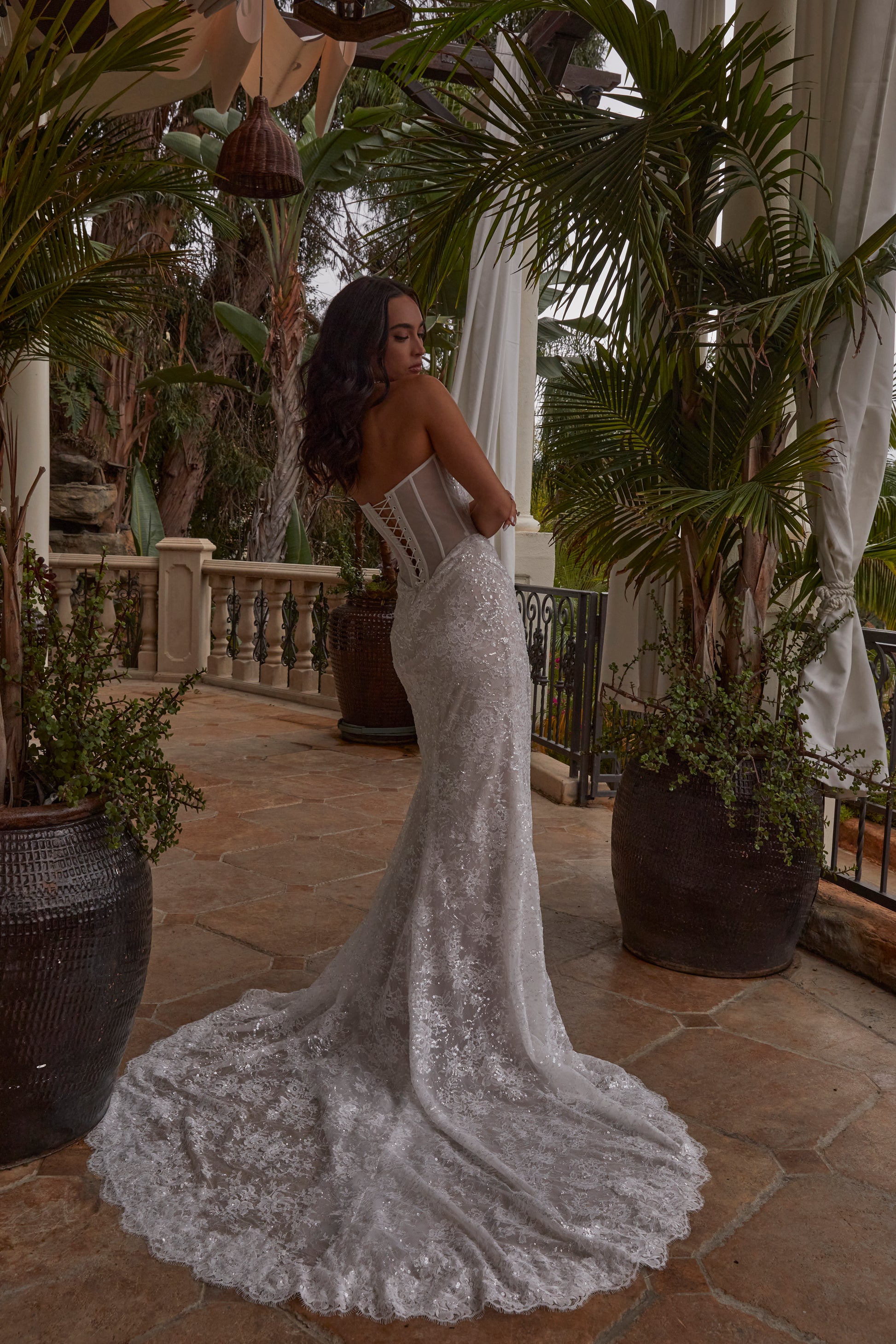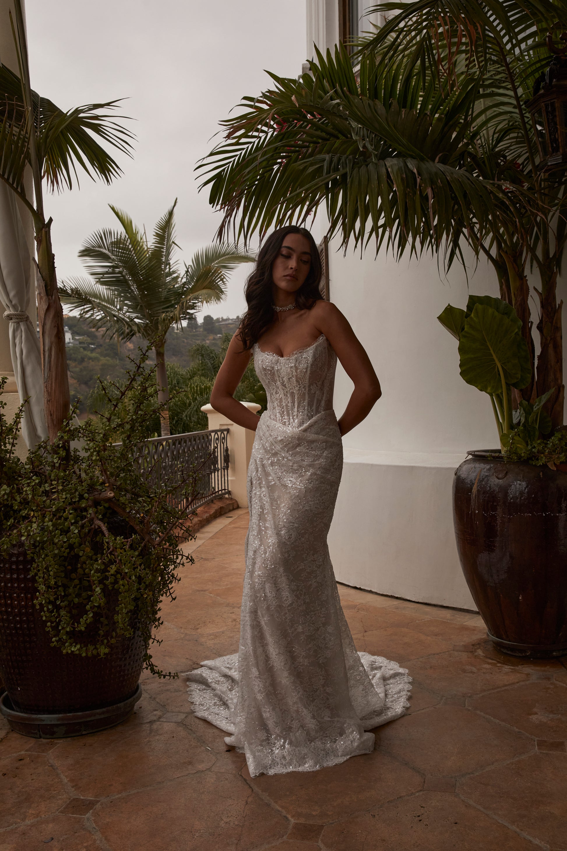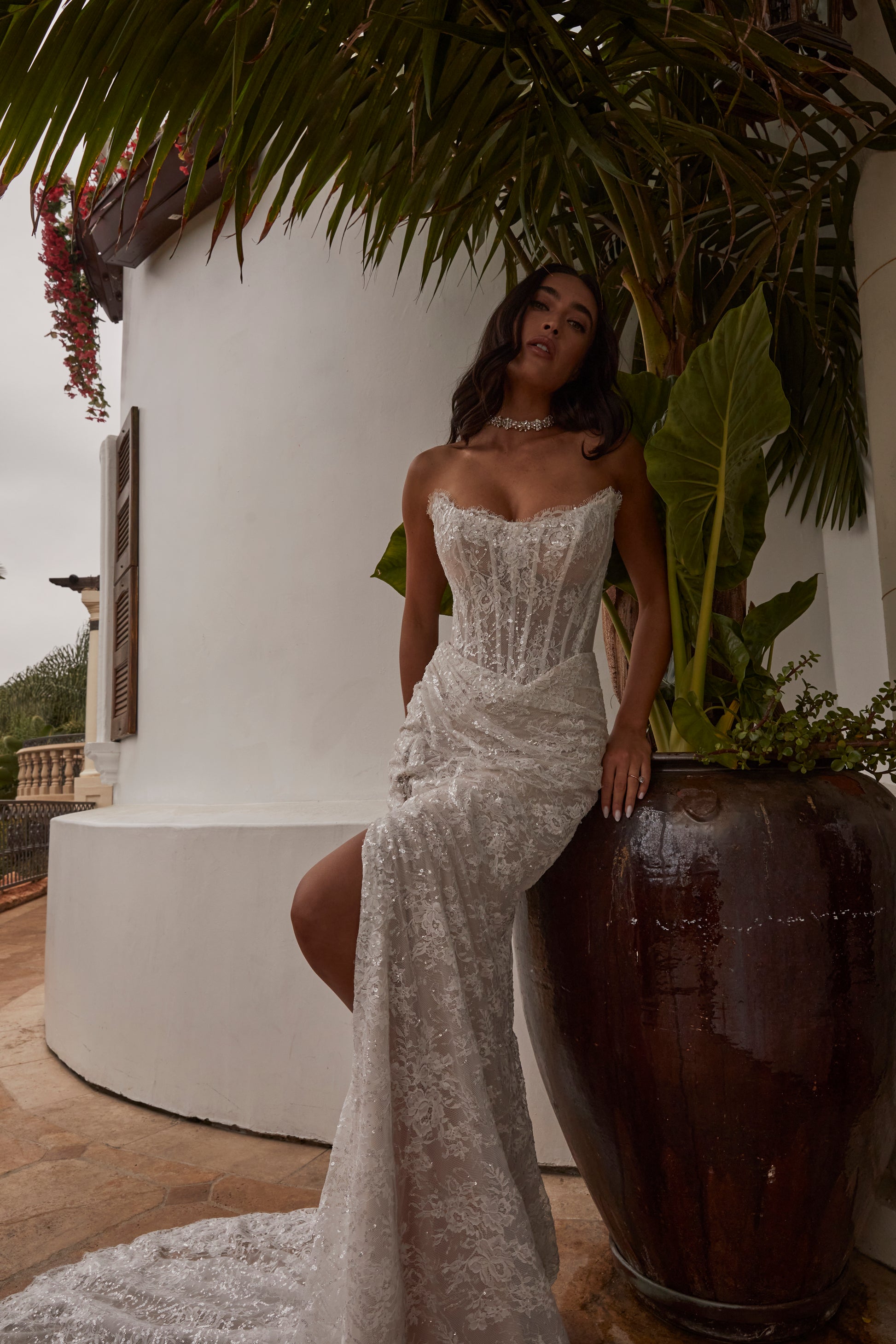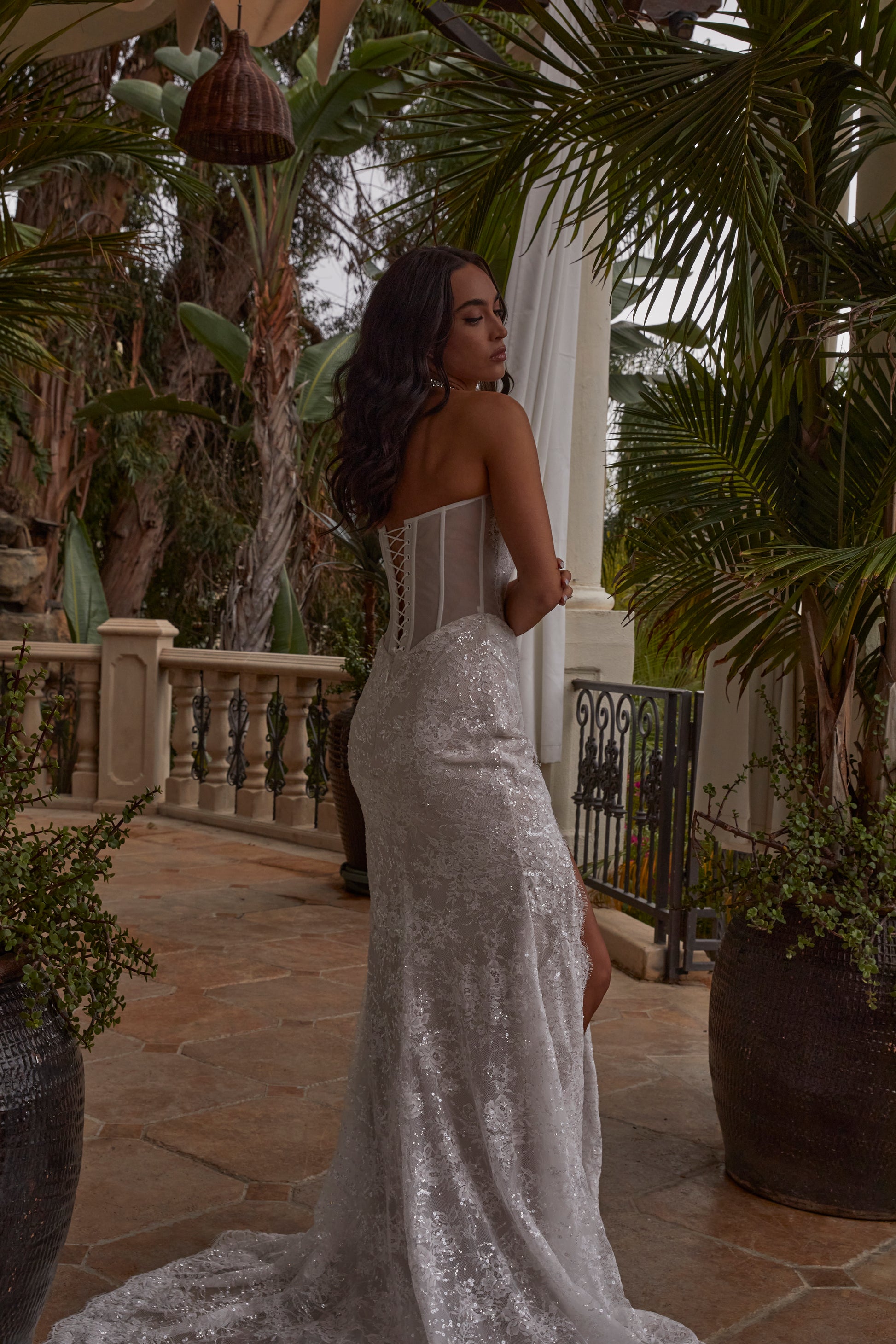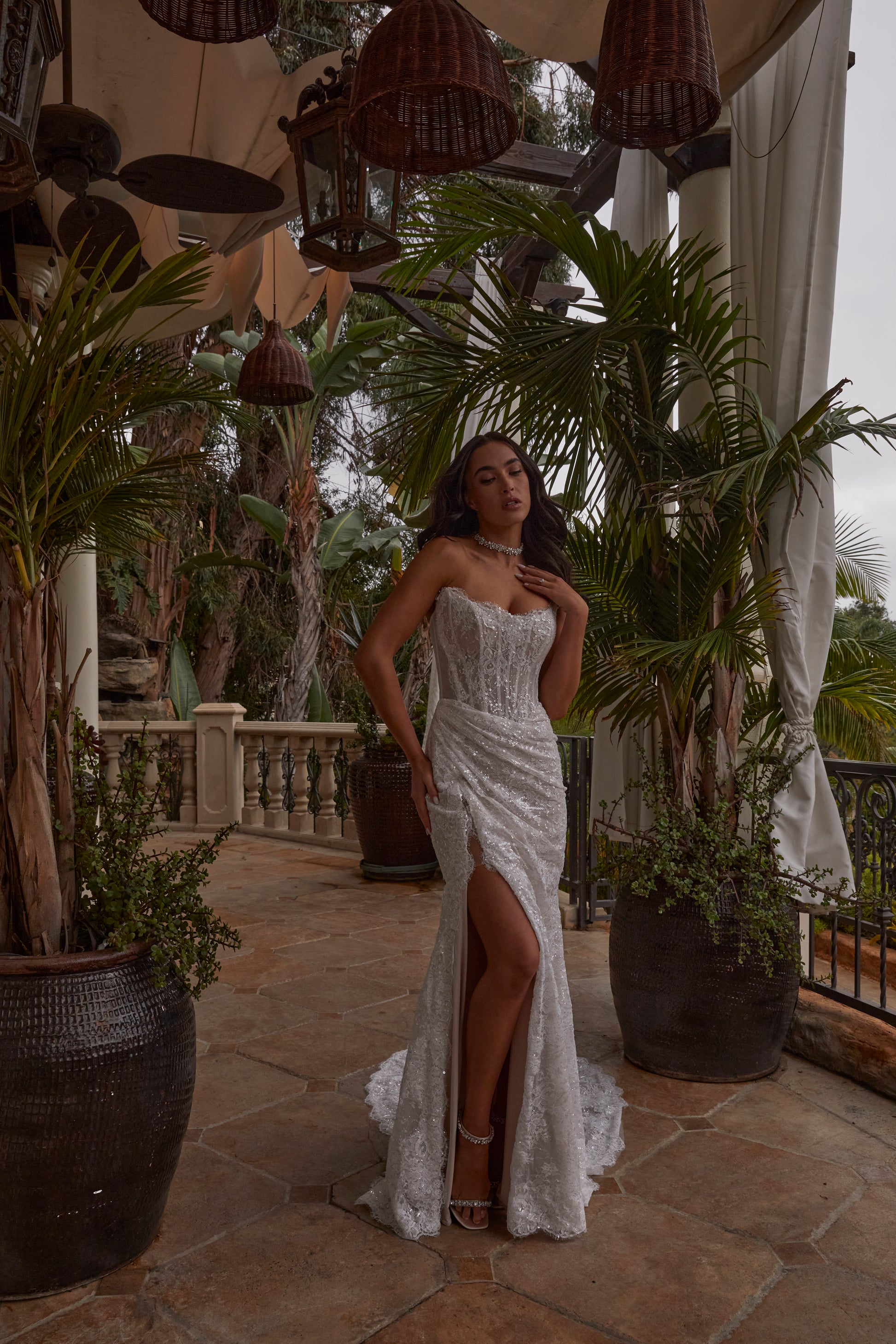 Meet VIOLETTE, the epitome of sophistication and allure in bridal couture. Crafted with meticulous detail, this sheath wedding gown features luxurious sequin Chantilly lace adorned with delicate eyelash trim, gracefully enveloping a soft jersey lining. The corset back ensures a flawless fit, while the ruched skirt adds dimension and movement, enhancing every step down the aisle. With a daring slit adding a touch of drama, VIOLETTE is perfect for the modern bride seeking elegance with a hint of sensuality.